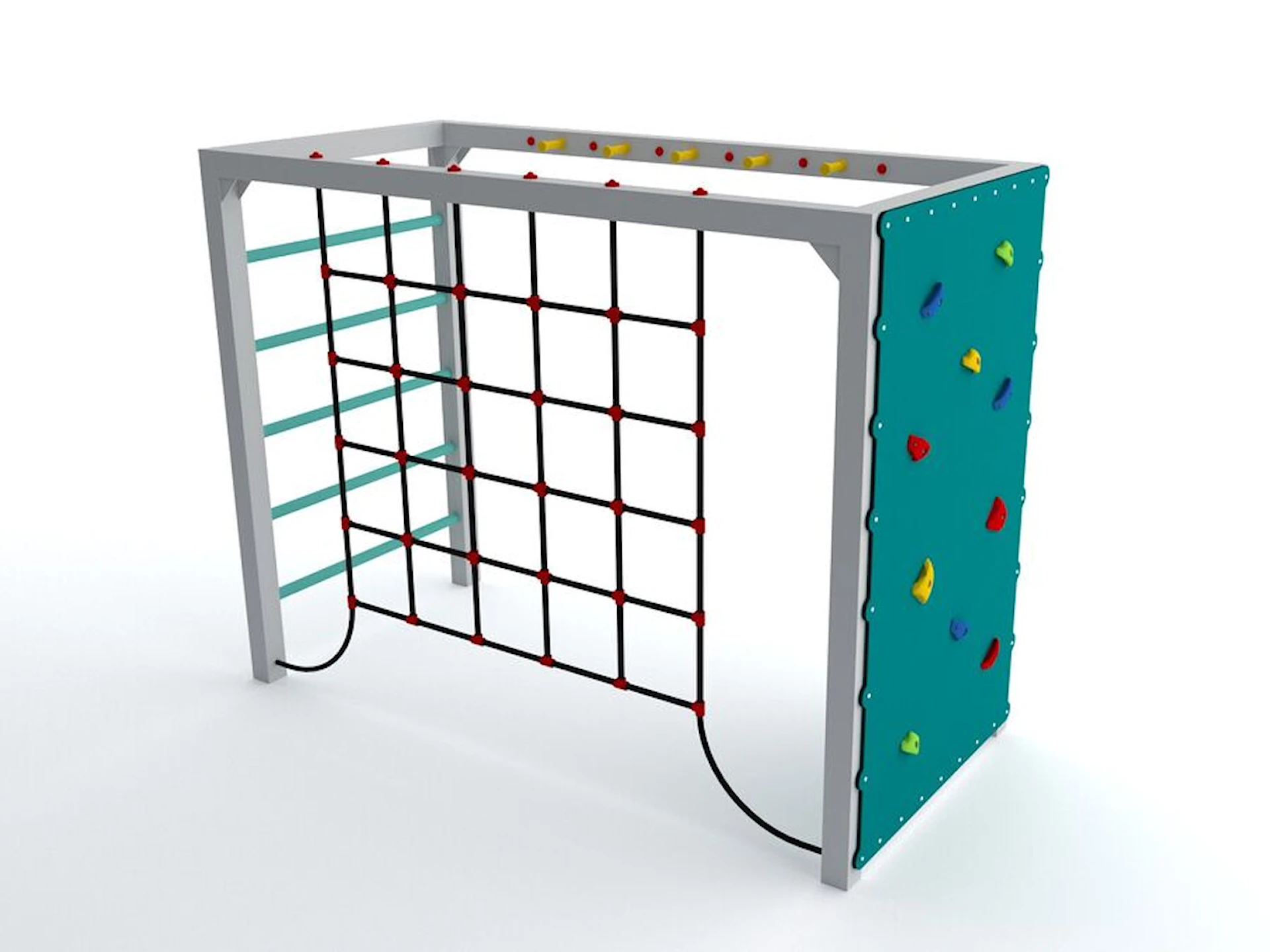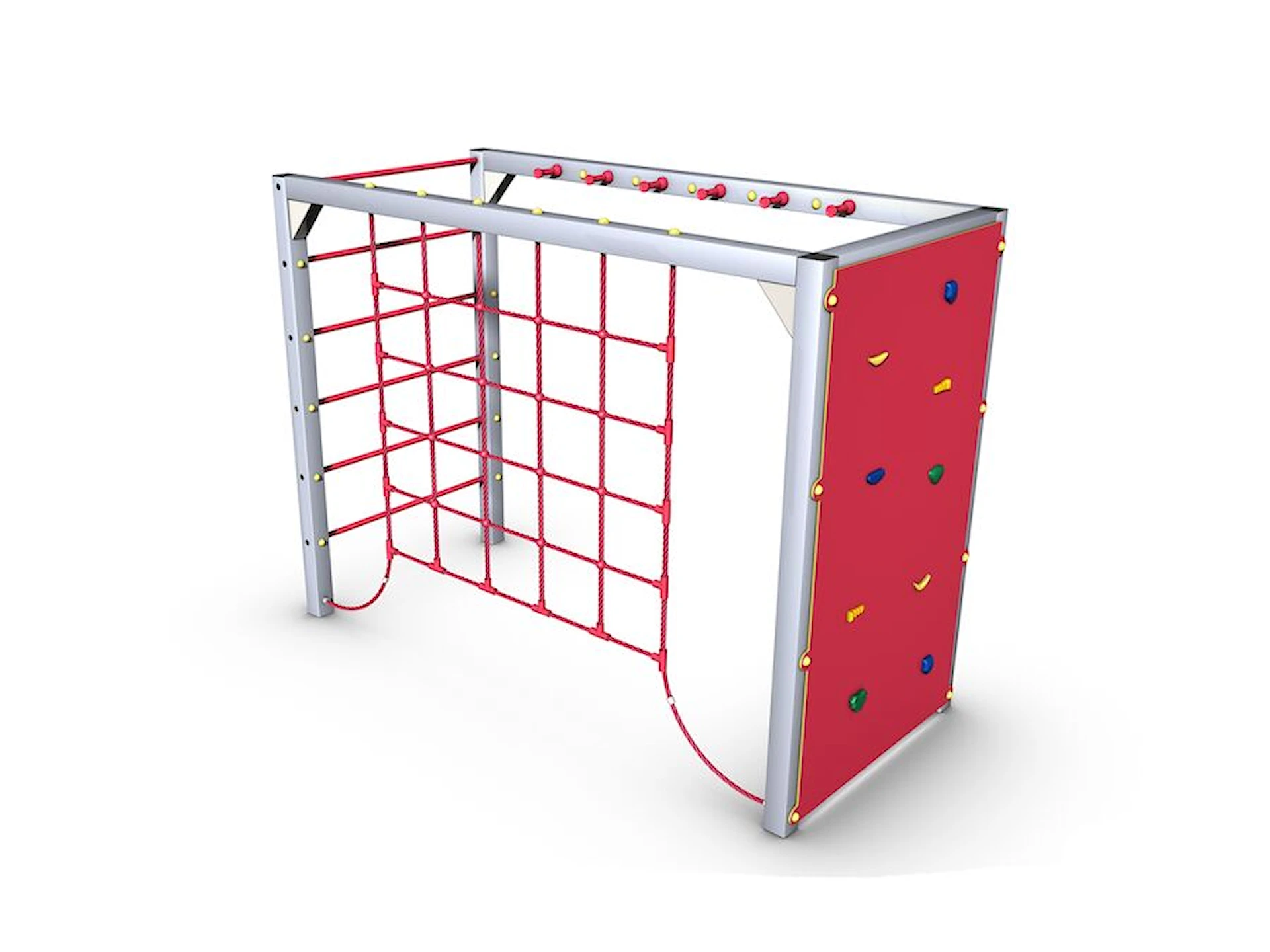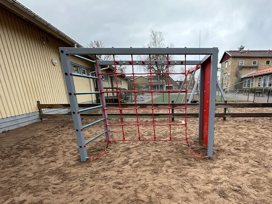 Saga Lekställning har stolpar tillverkade av brännlackerad aluminium, väggar av HDPE-plattor och rep med en stålvajer och skyddande beläggning för bästa hållbarhet.