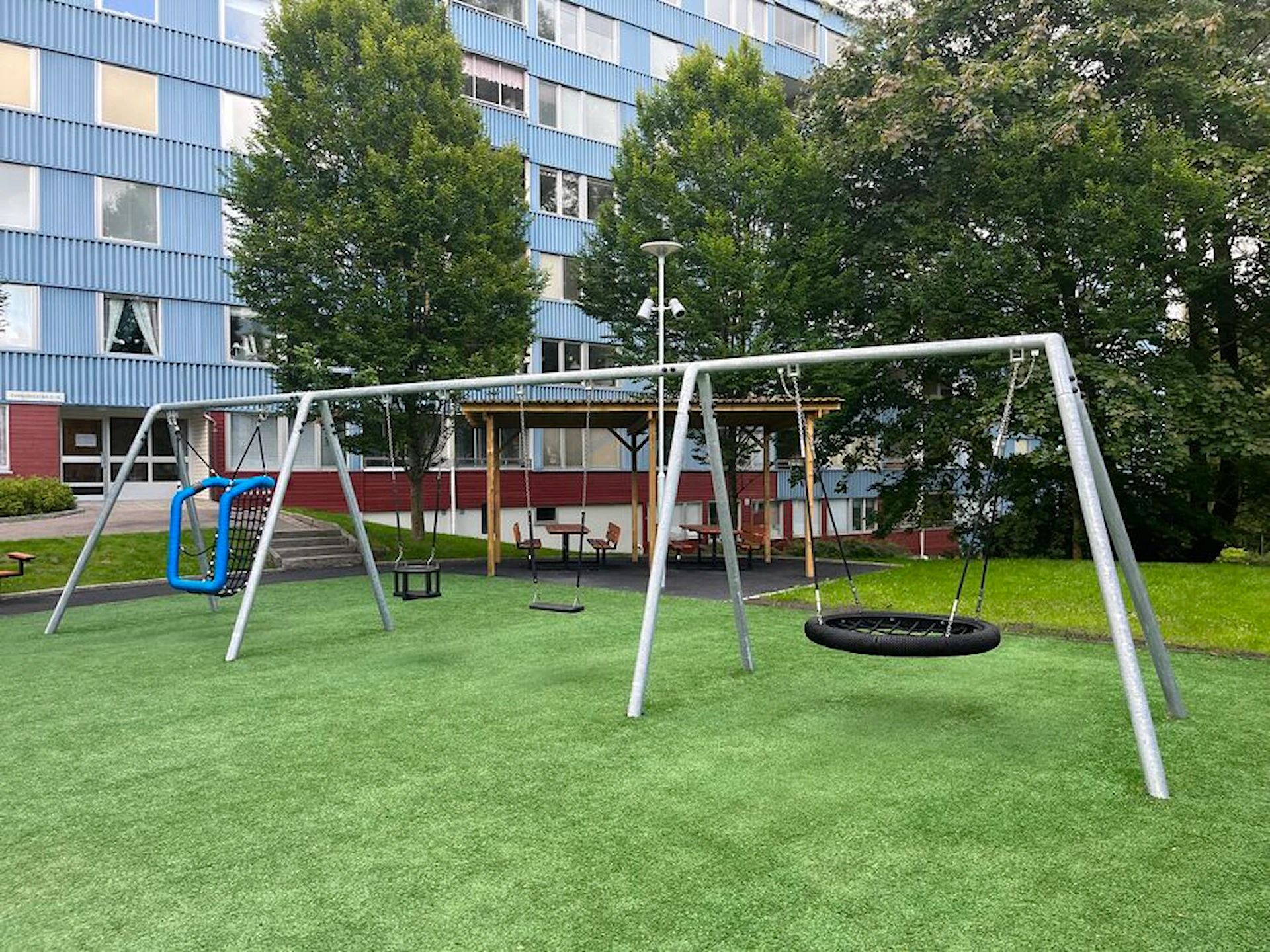 Däremot har vi många produkter utan trä som kan levereras i stort sett omgående, exempelvis Boulder Rocks, gungor, mål, basket, bordtennis, fristående rutschar, klätternät, studsmattor, bänkbord med mera.