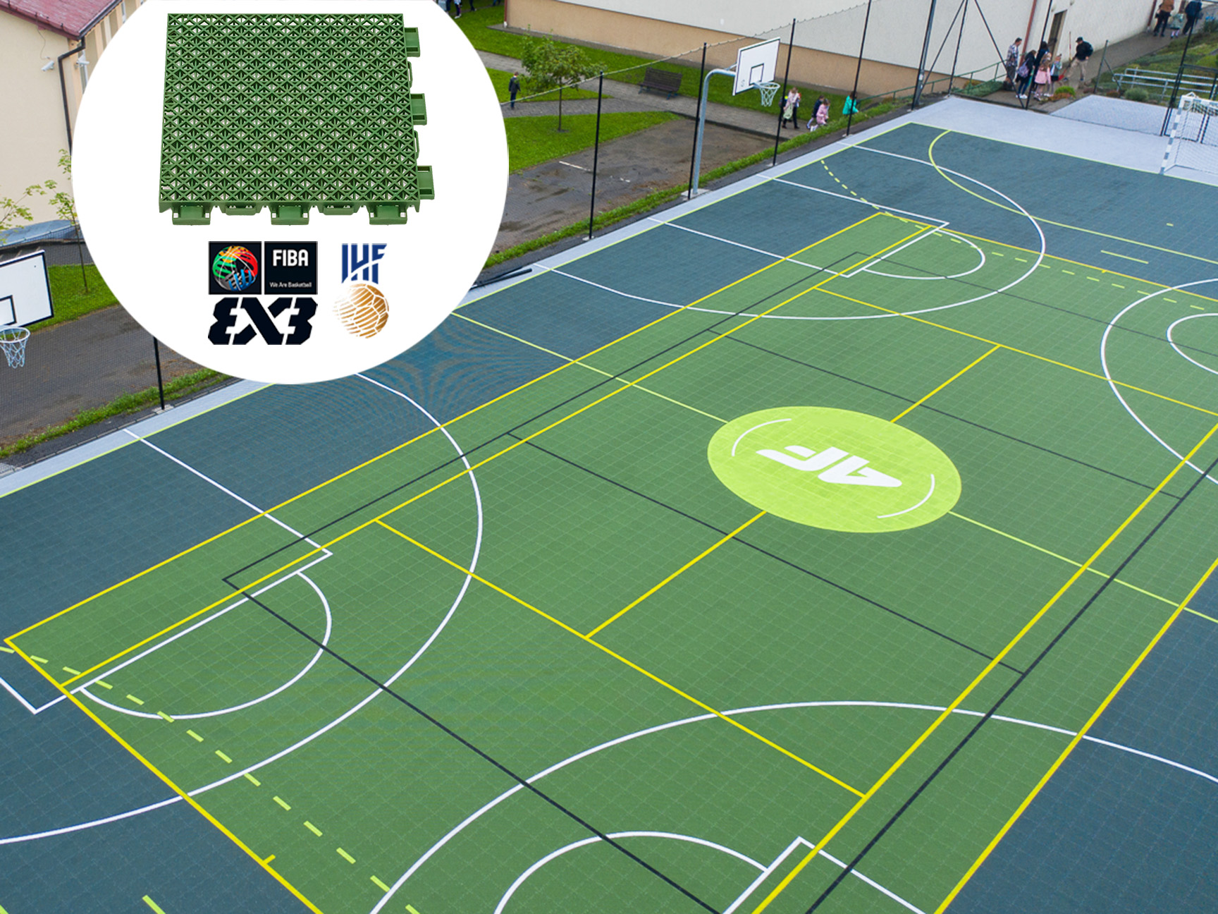 En modulär lösning som ger en stabil och behaglig yta att spela på. Levereras med planmarkeringar direkt på golvplattorna. Lösningen är FIBA-certifierad för matchbruk i 3x3 basket och är lämplig för både temporär installation vid evenemang eller som en permanent plan.