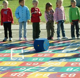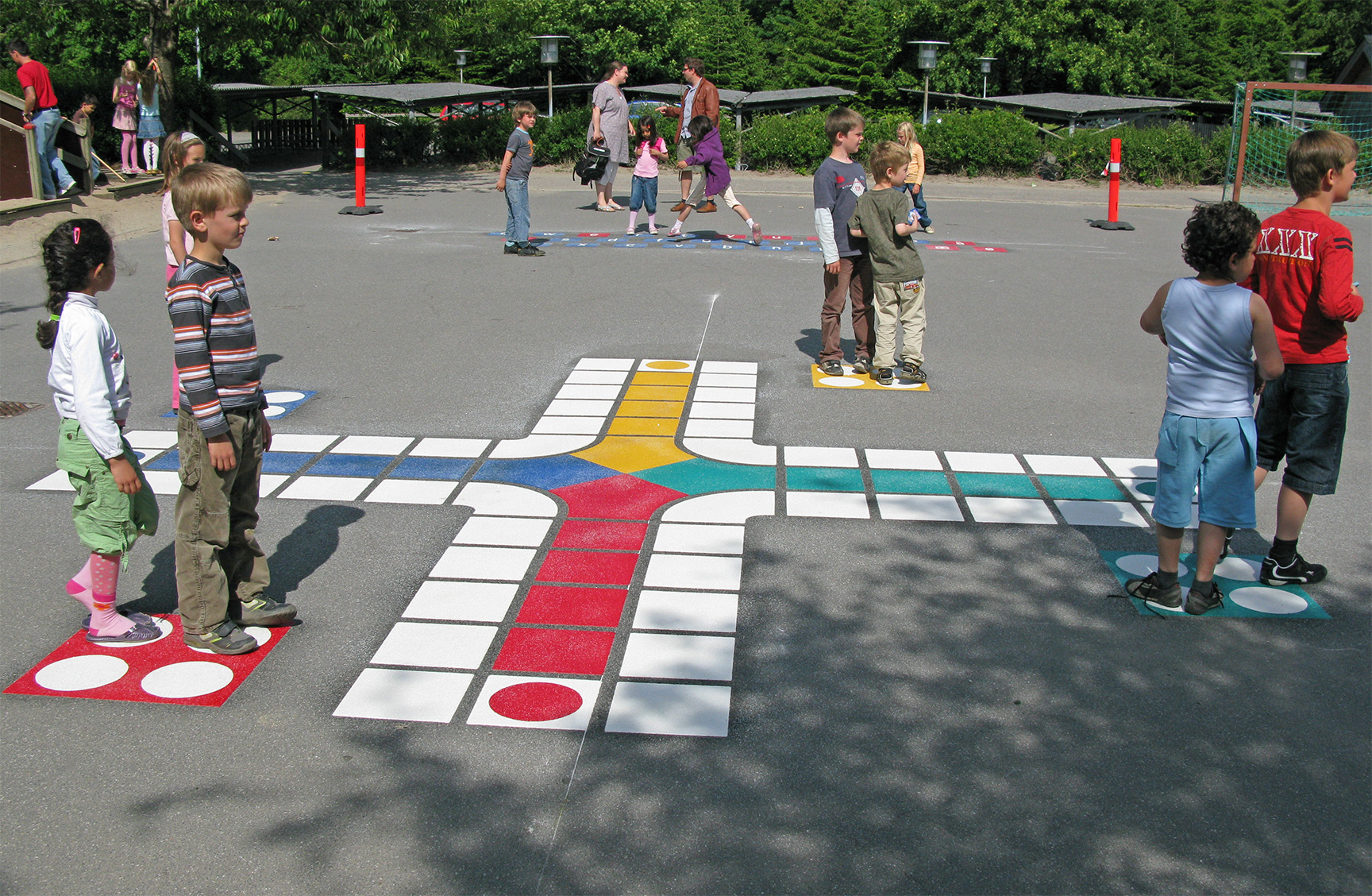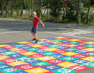 Vi erbjuder både motiv och montering av asfaltsmålningar till skolgårdar, innergårdar och andra ytor som behöver livas upp och få ett mer kreativt uttryck. Välj bland flera olika klassiska spel och aktiviteter som hoppa hage, fia med knuff, schack, sifferlekar och populära King out-rutor. Flytta ut hela klassen till skolgården och använd asfaltsmålade siffror och bokstäver i undervisningen. Ett garanterat populärt sätt att lära sig räkna och stava.