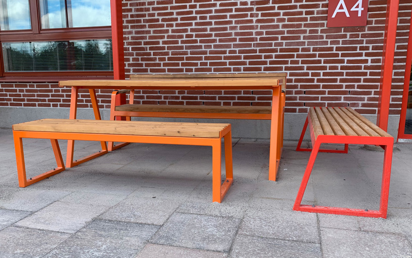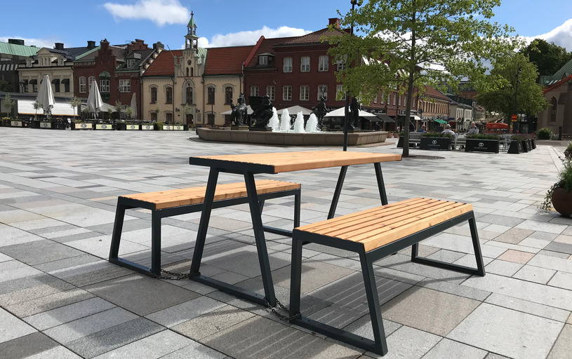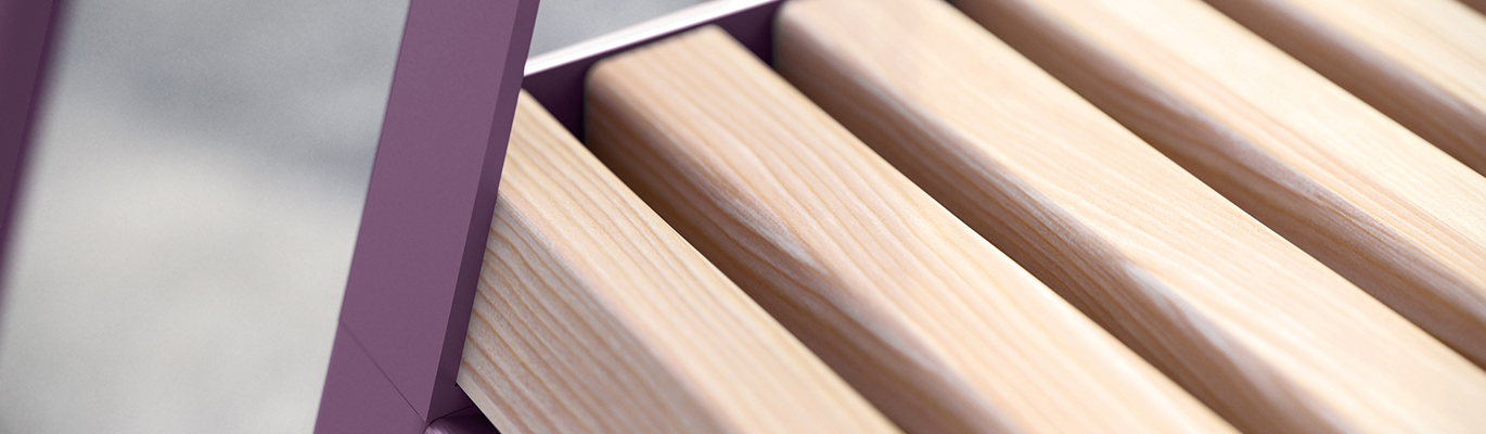 De smala ribborna i lärkträ tillsammans med pulverlackerat stål i valfri färg gör det enkelt att placera möbler ur denna familj nästan var som helst. Kombinera ihop bänkar, bord och papperskorgar med planteringskärl och cykelställ för att få till den där ombonade känslan på en innergård eller mötesplats.