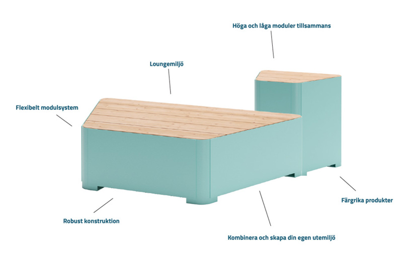 I sortimentet finns både höga och låga moduler som kan kombineras med varandra, för att du ska kunna bygga ihop en unik utemiljö som passar just ditt projekt. Med hjälp av våra inspirationsritningar och nedladdningsbara dwg-filer kan du enkelt se hur varje separat modul kan bidra till en helhet.