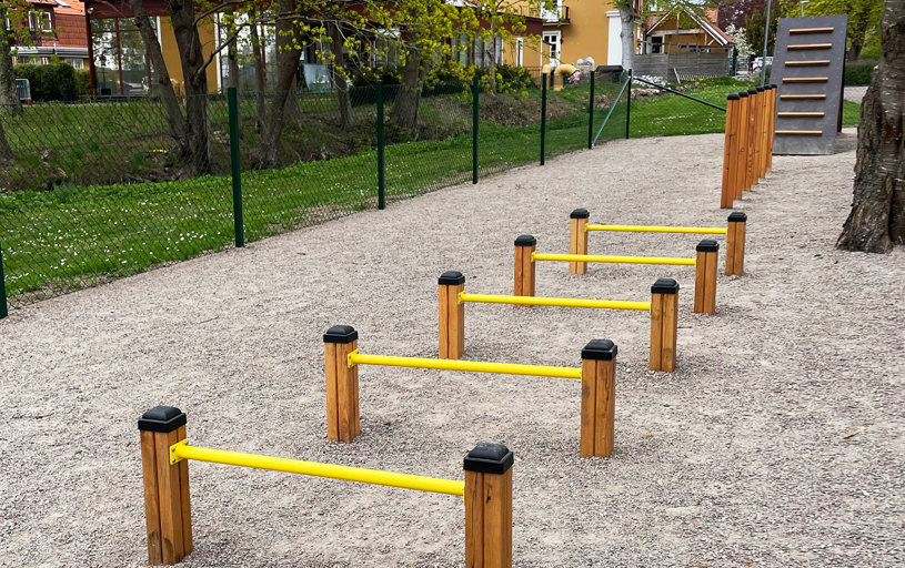 Agilitybanan innehåller fyra robusta fasta hinder på rad. Ett A-hinder för balansträning, ett slalomhinder som övar upp smidigheten, fem små hopphinder som ger benstyrka och så de spännande hoppringarna. Har du korta ben väljer du den lägre hoppringen och är du långbent så kanske du klarar den höga hoppringen. Oavsett storlek kan alla hundar träna här tillsammans med sin matte eller husse.