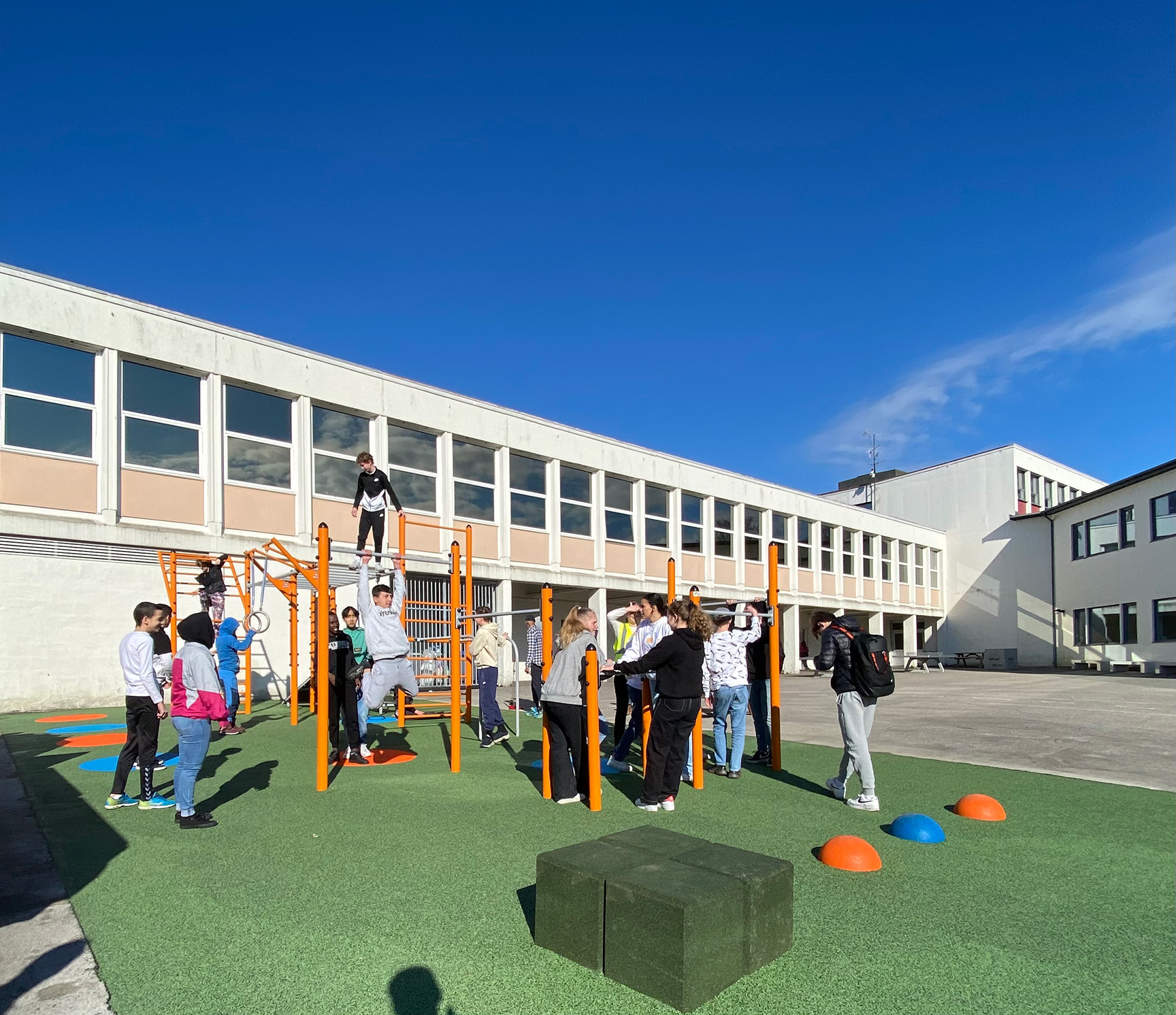 Kunden valde sin egen RAL-färg på flera av enheterna och den färgglada variationen i EPDM-underlaget ger snyggt blickfång på skolgården.