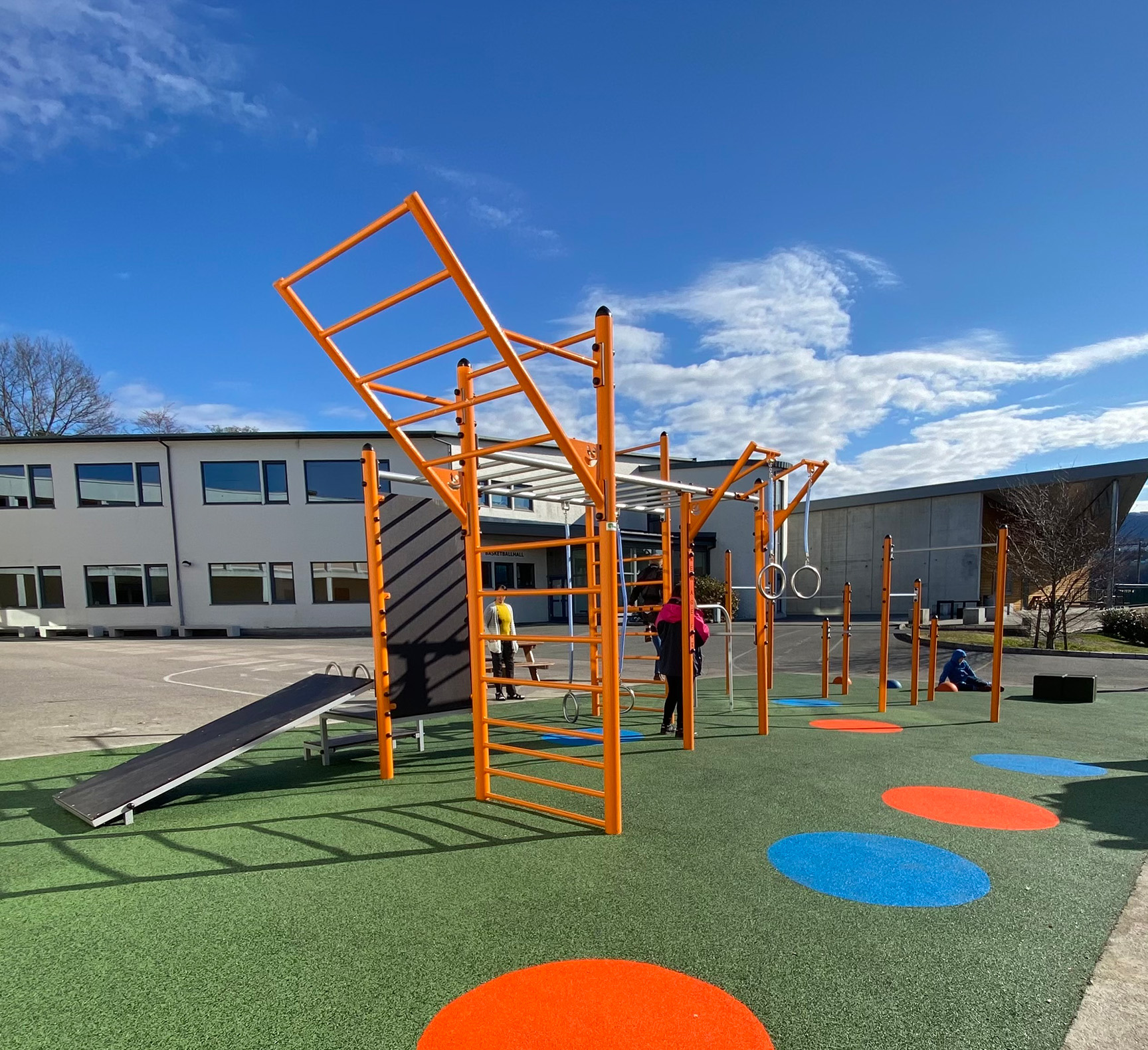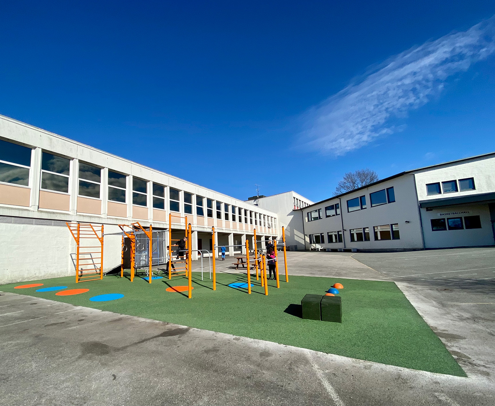 Detta resulterade i en spännande och inbjudande lekplats med möjligheter till både spel och sport med bordtennis och basket samt pulshöjande aktiviteter i utegymmet och på klätterväggen.