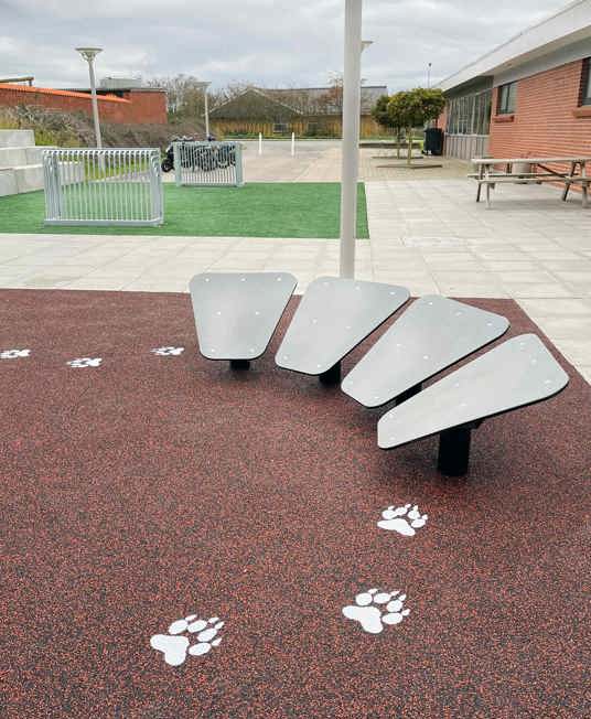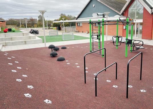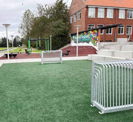 I Dybvad i Danmark ville man skapa en bättre koppling mellan skolan och idrottshallen, som hittills varit åtskilda av staket och mur. Området är nu öppet, tillgängligt och sammanvävt med ett aktivitetsområde, till glädje för både skolans elever och idrottsföreningens dagliga besökare.