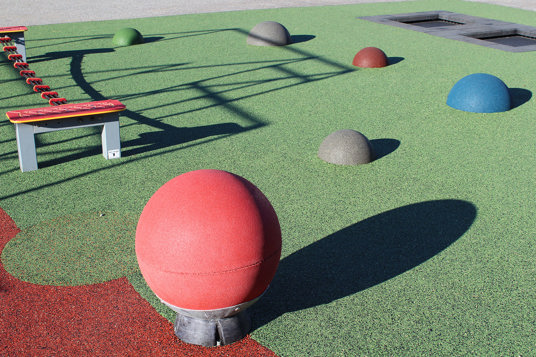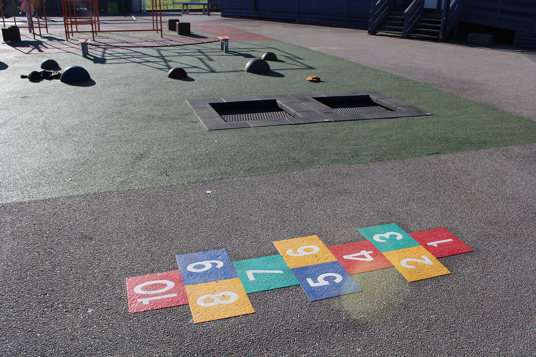 Skolans livliga uttryck i sprakande färger kan användas till både lärande och lek. Kanske hålls dagens gympalektion i multiarenan, på parkourställningen eller balansbanan?