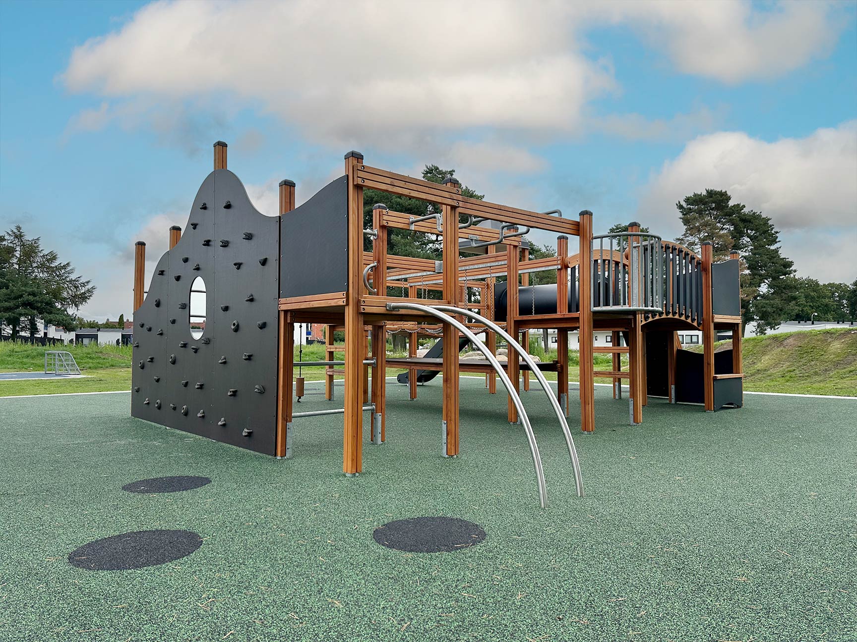 Lekplatsen ritades i samarbete med arkitekten som ansvarade för resten av utemiljöerna i det nya området. Det ger en fantastisk helhetskänsla i hela bostadsområdet.