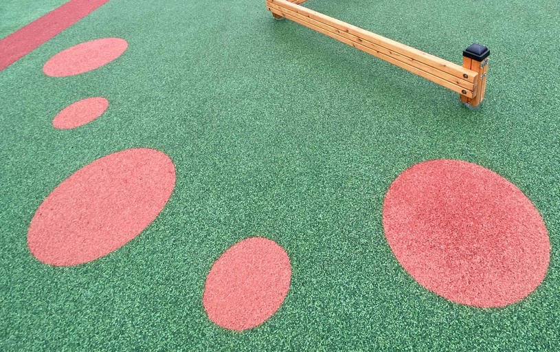 Lekplatsen erbjuder även en liten balansbana för de yngre barnen, som kanske inte vågar klättra upp i lekställningen ännu. I gummiunderlaget finns prickar att hoppa på, där även de vuxna kan testa balansen.