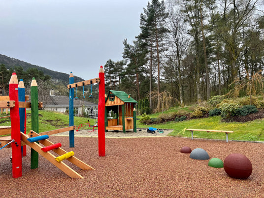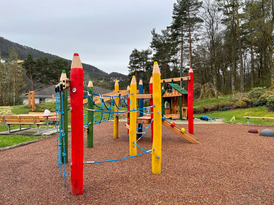 Flera av lekredskapen på Lynghaug BRF har en fantasifull och färgstark twist i sin design som inbjuder till rollspel och spännande lek för de minsta.