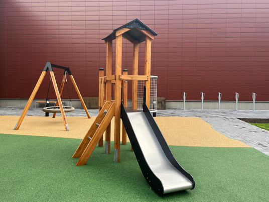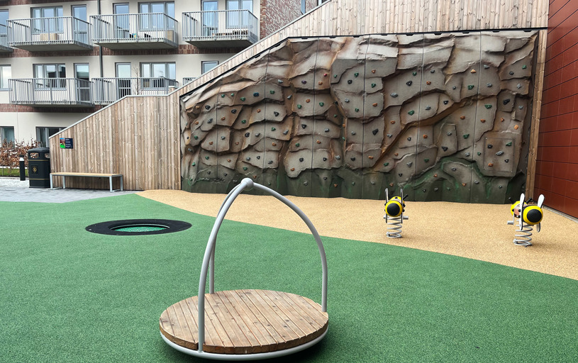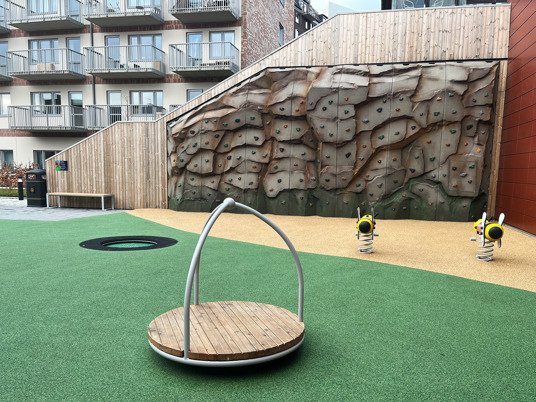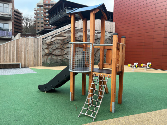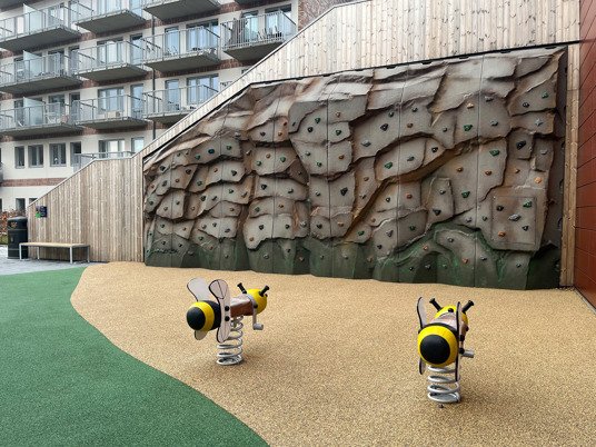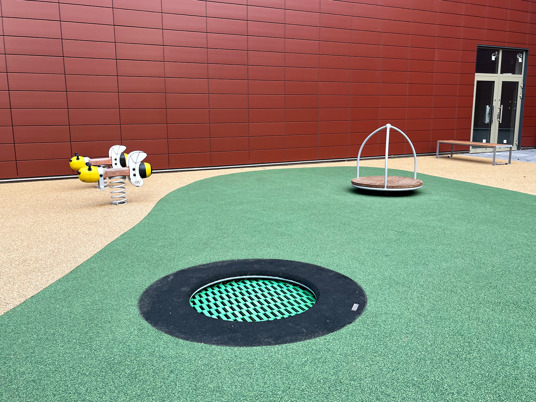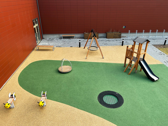 Det underhållsfria fallskyddsgummit New Generation i färgerna sandmix och mossgrönt smälter in riktigt fint i omgivningen.
