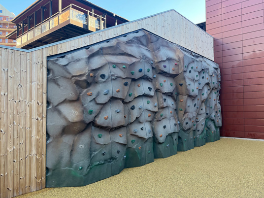 Klätterväggen är arkitektritad och speciellt anpassad för just denna plats. Boulder Rocks Bergväggen ger många spännande utmaningar till både unga och äldre klättersugna besökare.
