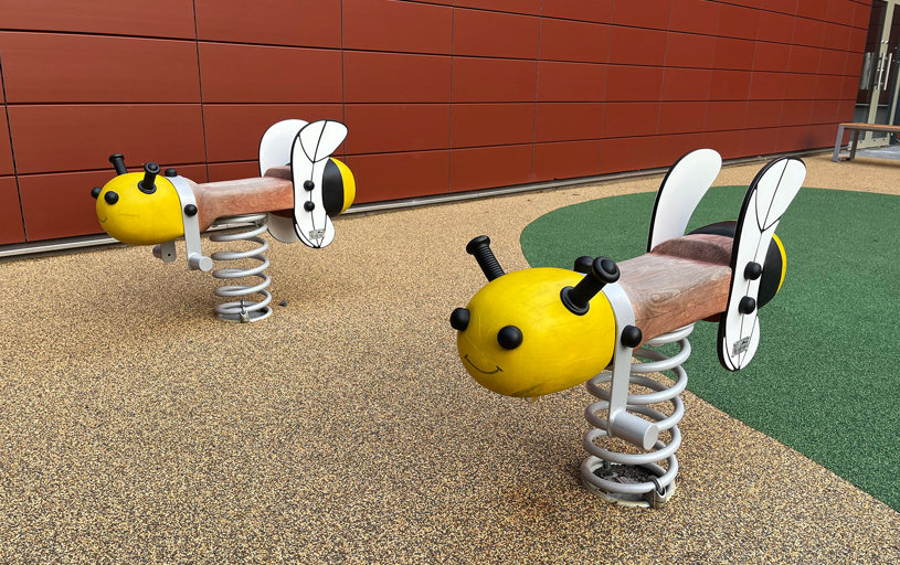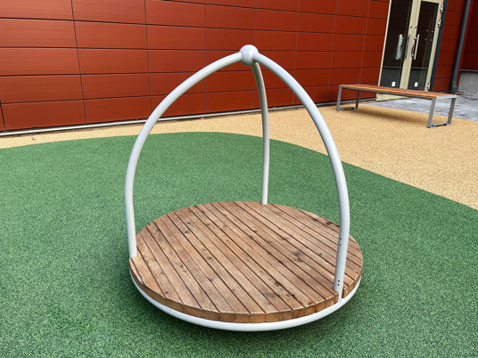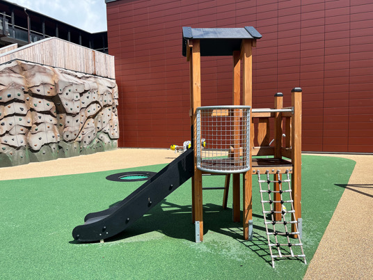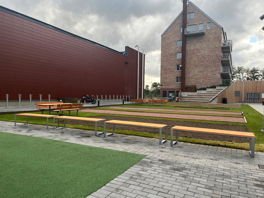 För de som behöver en paus i lekandet eller bara vill sitta och njuta finns här fina parkbänkar utplacerade. Tucana Parkbänk från Mobilis Design är tillverkad av samma träslag som lekutrustningen vilket ger perfekt harmoni.