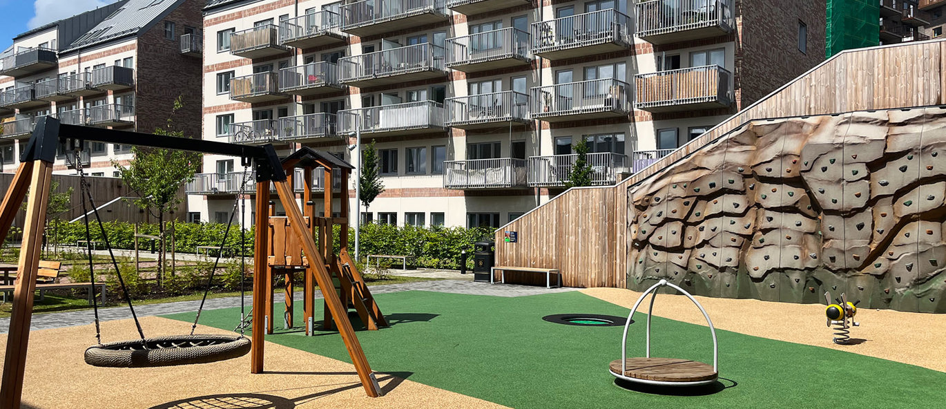 Härligt belägen lekplats i det nybyggda bostadsområdet i Mölnlycke. Lekplatsen ligger precis bredvid nya Wallenstam Arena och erbjuder många lekupplevelser till alla barn och ungdomar i området. Snurra, hoppa, gunga, klättra och kana allt vad det går!