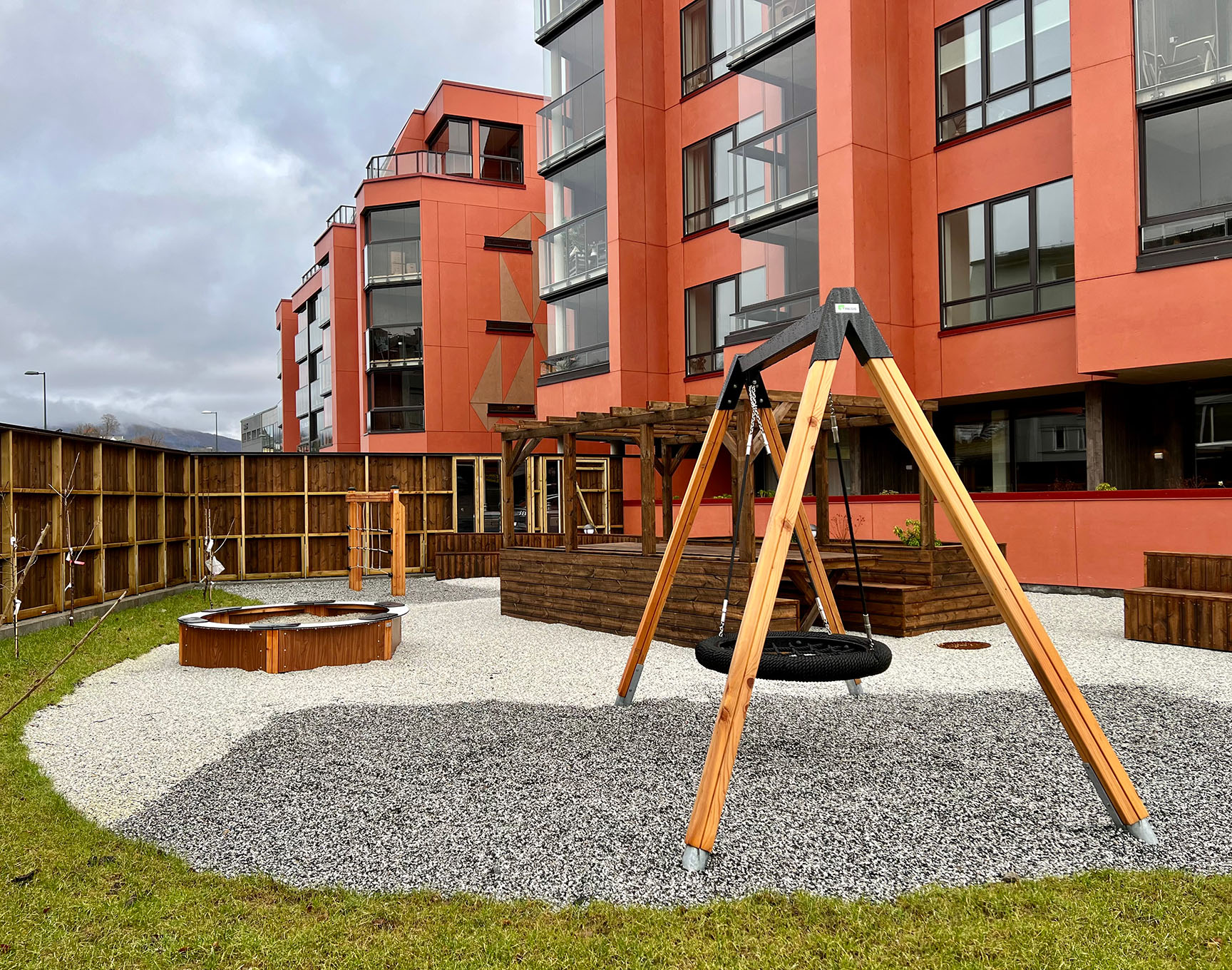 Här finns fågelbogunga, sandlåda och klätternät till stor glädje för bostadsrättsföreningens yngre invånare. Bänkbord och blomlådor i lärk bibehåller den röda tråden och ger en ombonad ram runt området. Bänkborden på takterrassen gör det enkelt för både unga och äldre att umgås.
