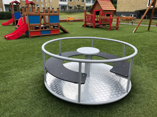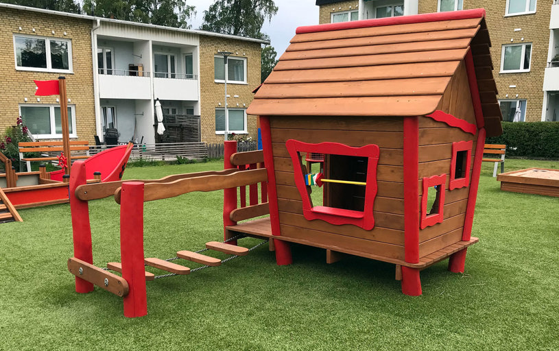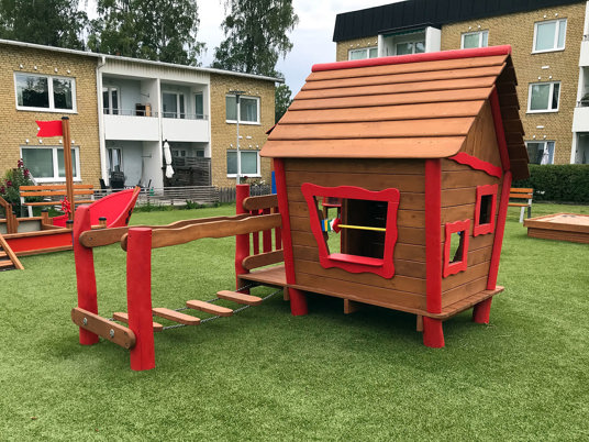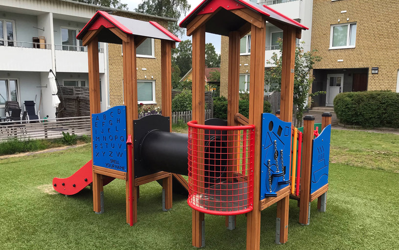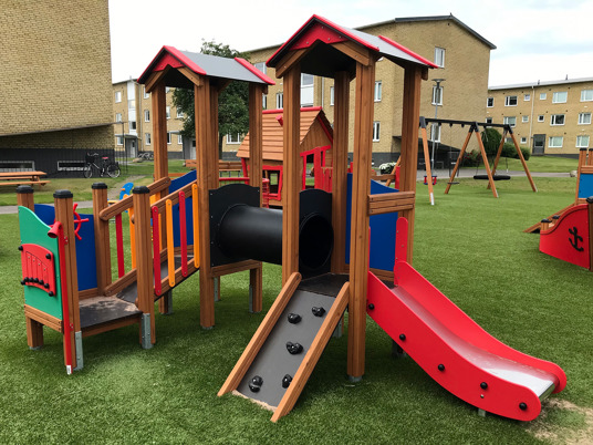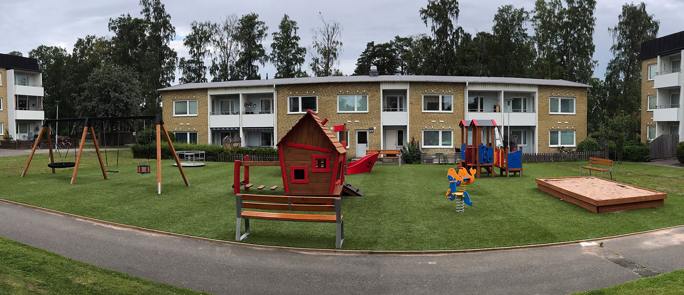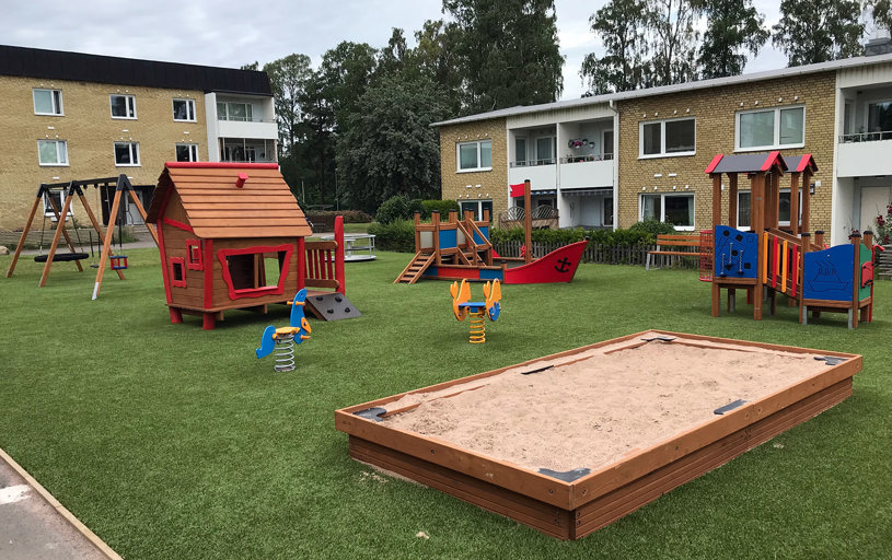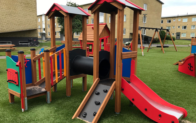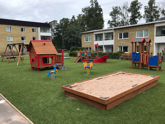 Tress hade totalentreprenad med rivning av gammal utrustning, markarbeten, leverans av lekutrustning, montering och läggning av konstgräs. Vi valde konstgräs som underlag för att få en grön och trevlig yta året runt. Detta projekt var smidigt och enkelt för kunden hela vägen från första kontakten.