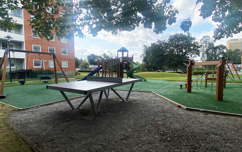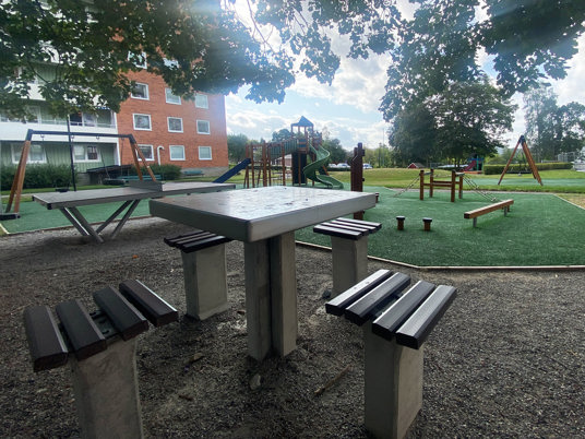 Skissen innehöll både lekytor och samlingsplats för umgänge och spel. Betongbordet med Fia med knuff och pingisbordet är populära i alla åldrar. Nu kan småbarnen, ungdomarna och alla vuxna umgås och ha kul på samma ställe.