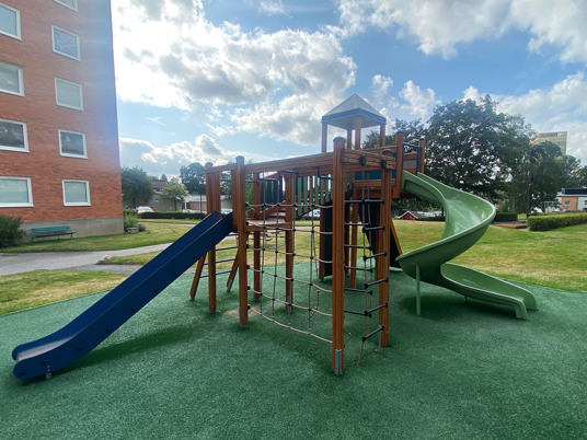 Balansbanan ger lite pirr i magen och för de som vågar finns det klätterutmaningar upp till Twister-tornet. Däruppe är det fin utsikt över hela innergården. Vilken rutsch väljer du ner igen?