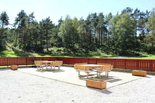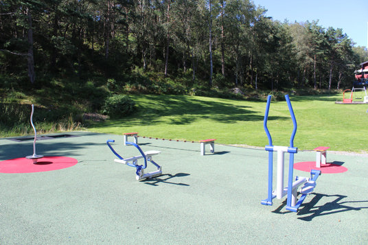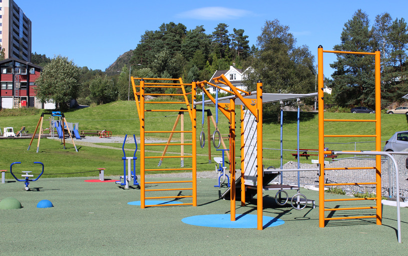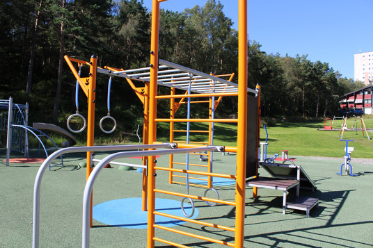 Här finner man flera sociala zoner mellan lekställningarna och träningsstationerna. Bänkar och bord används för att skilja ytorna åt, men skapar också trevliga samlingsplatser i grannskapet.