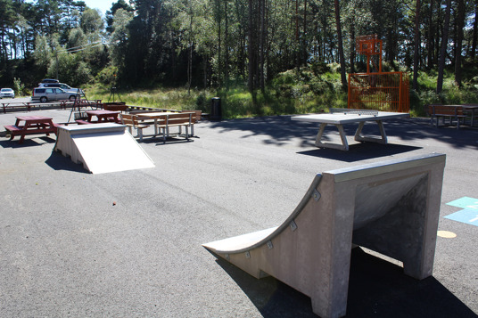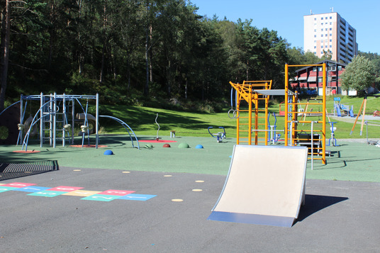 Detta resulterade i en stor mötesplats uppdelad i flera olika zoner. Här kan de yngsta låta fantasin flöda i en spännande lekmiljö, samtidigt som skateområdet utmanar motoriken hos både unga och lite äldre!