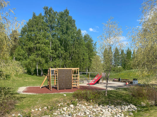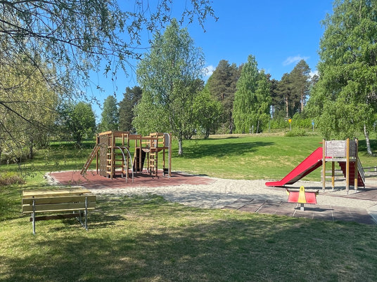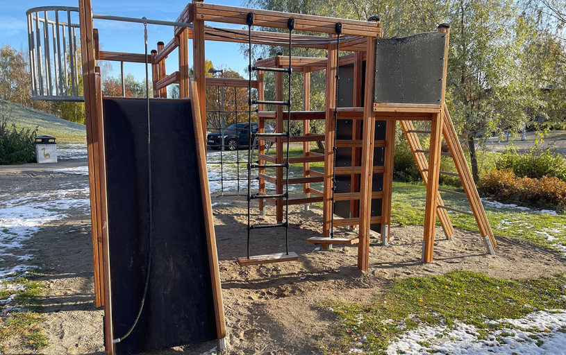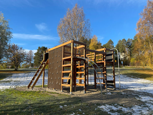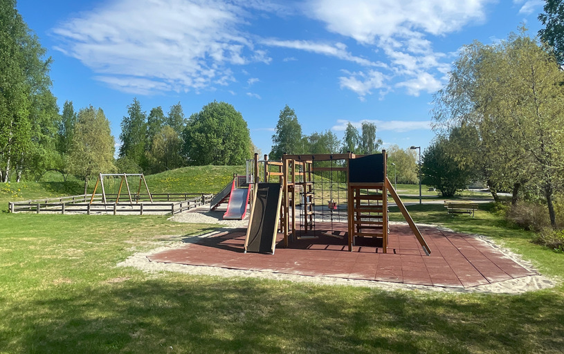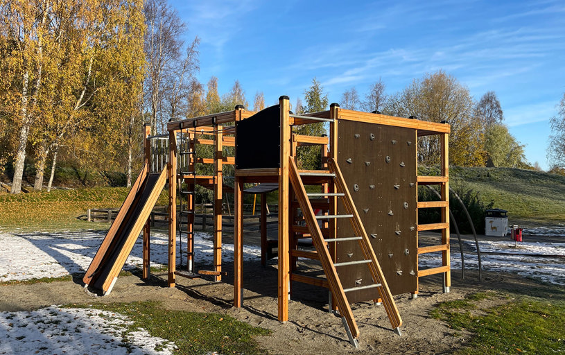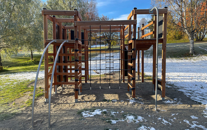 2023 gjorde vi en uppgradering av lekutrustningen i Skolbyparken i Åsele. Här fanns sedan tidigare en gungställning, rutschkana och bänkar att sitta på. Genom att addera en större klätterställning kan fler barn i ett större åldersspann känna sig välkomna att leka här.