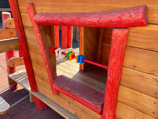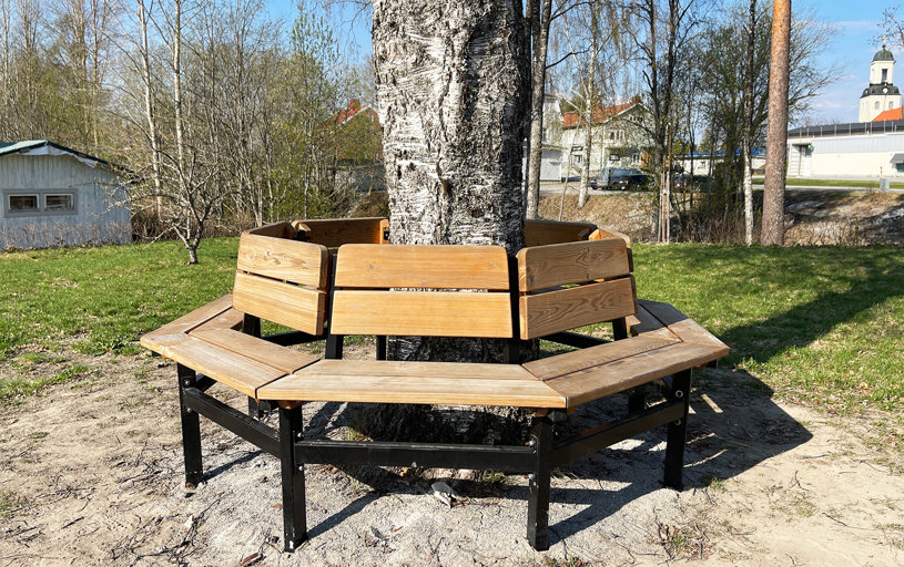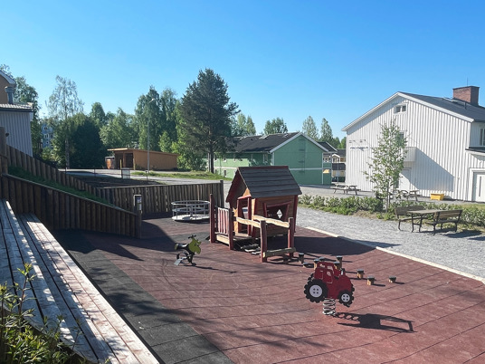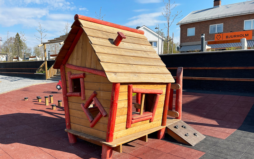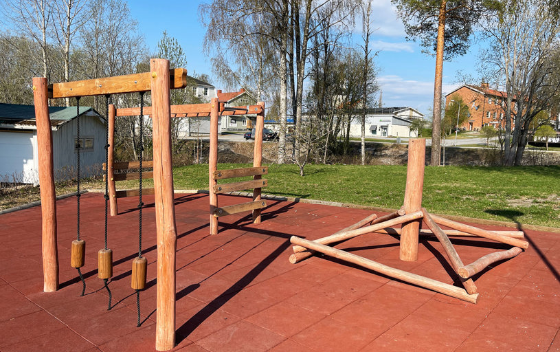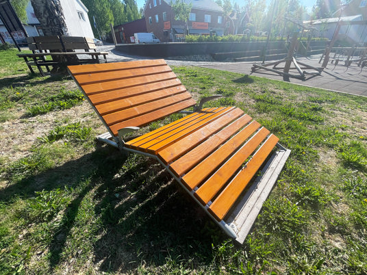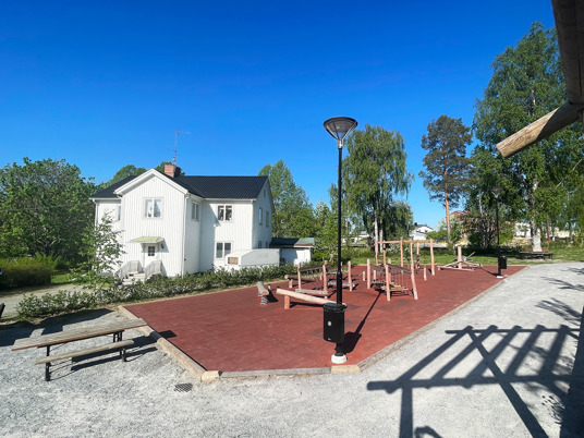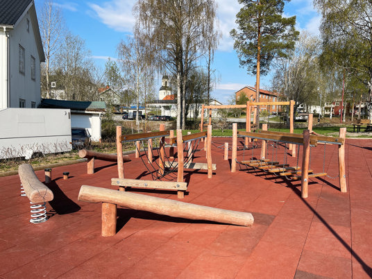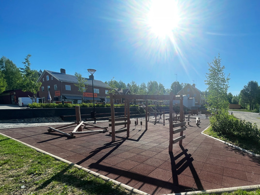 Det blev ett stort lyft för centrala Bjurholm där denna plats idag är den naturliga mötesplatsen. Med bänkar, solstolar och en härlig lekplats kan hela byn sluta upp på samma plats. En lyckad kombo av park och lekplats!