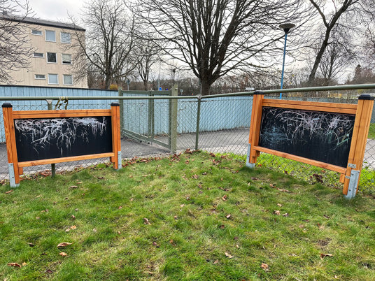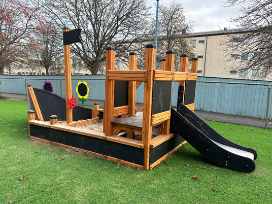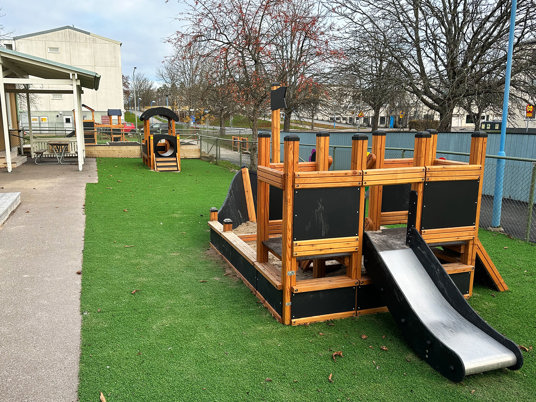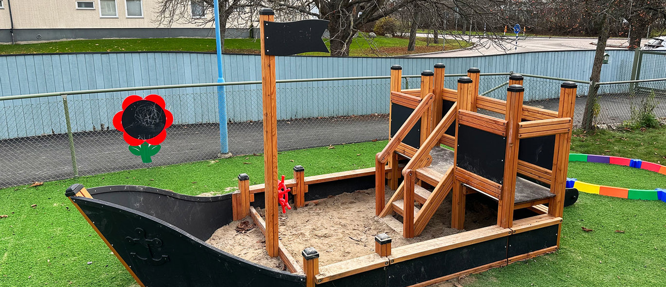 Förskolans utegård erbjuder något för alla åldrar. Mycket variation med klättring, plattformslek och båtar med sandlåda inuti. Båt och tåg är alltid populära ingredienser på en lekplats.