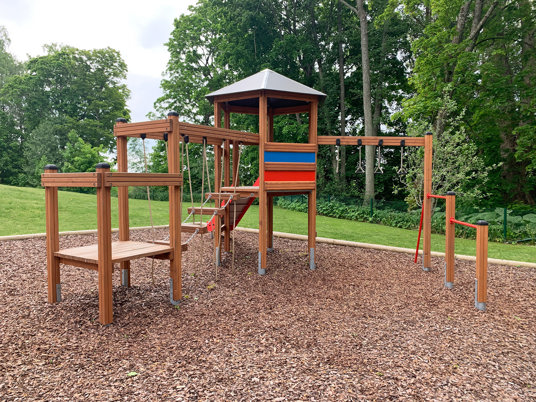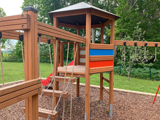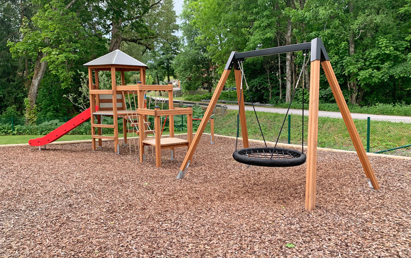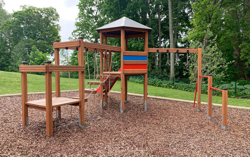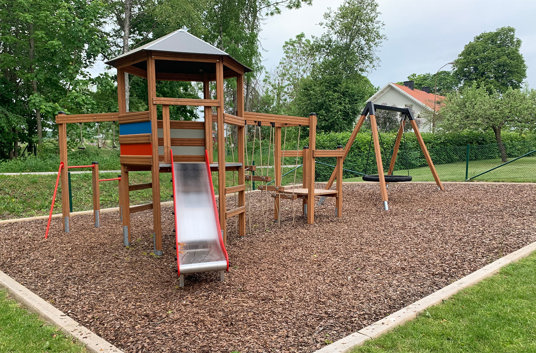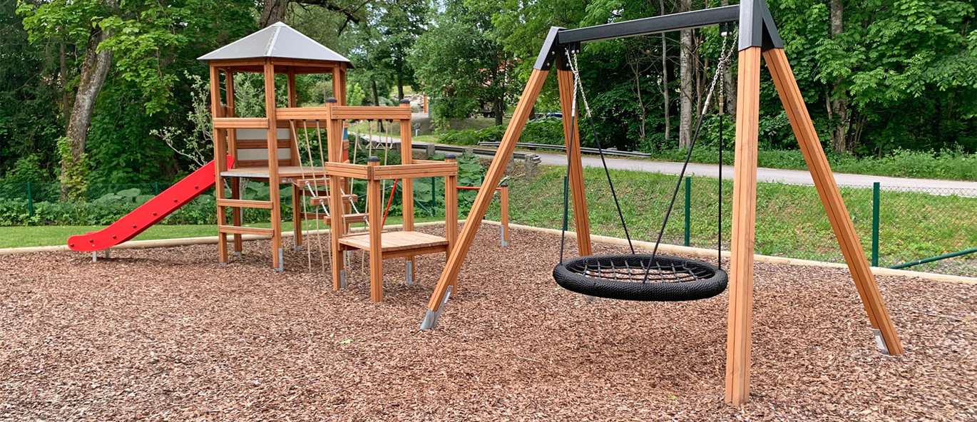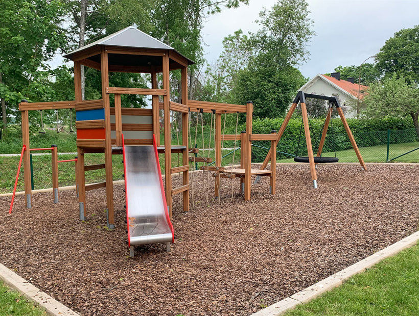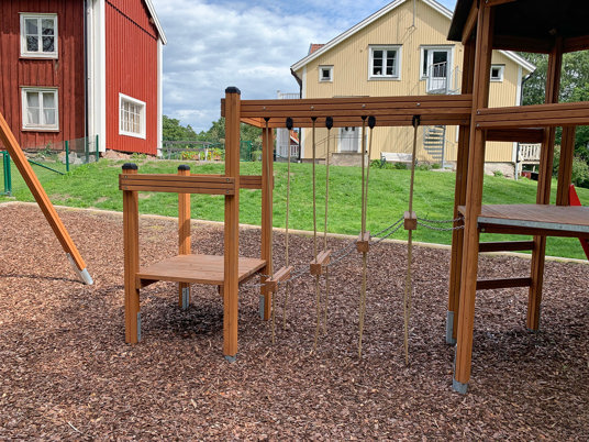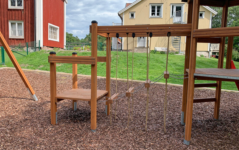 Barnen uttryckte även önskemål om en kompisgunga, en rutschkana och någon mer typ av utmaning. Här passade Klätterkanten perfekt in med både rutschkana och spännande moment som volträcke, armgång och en balansstege som hänger i rep. Att allt sitter ihop gjorde att man sparade yta och även fick plats för gungställningen med fågelbogungan.