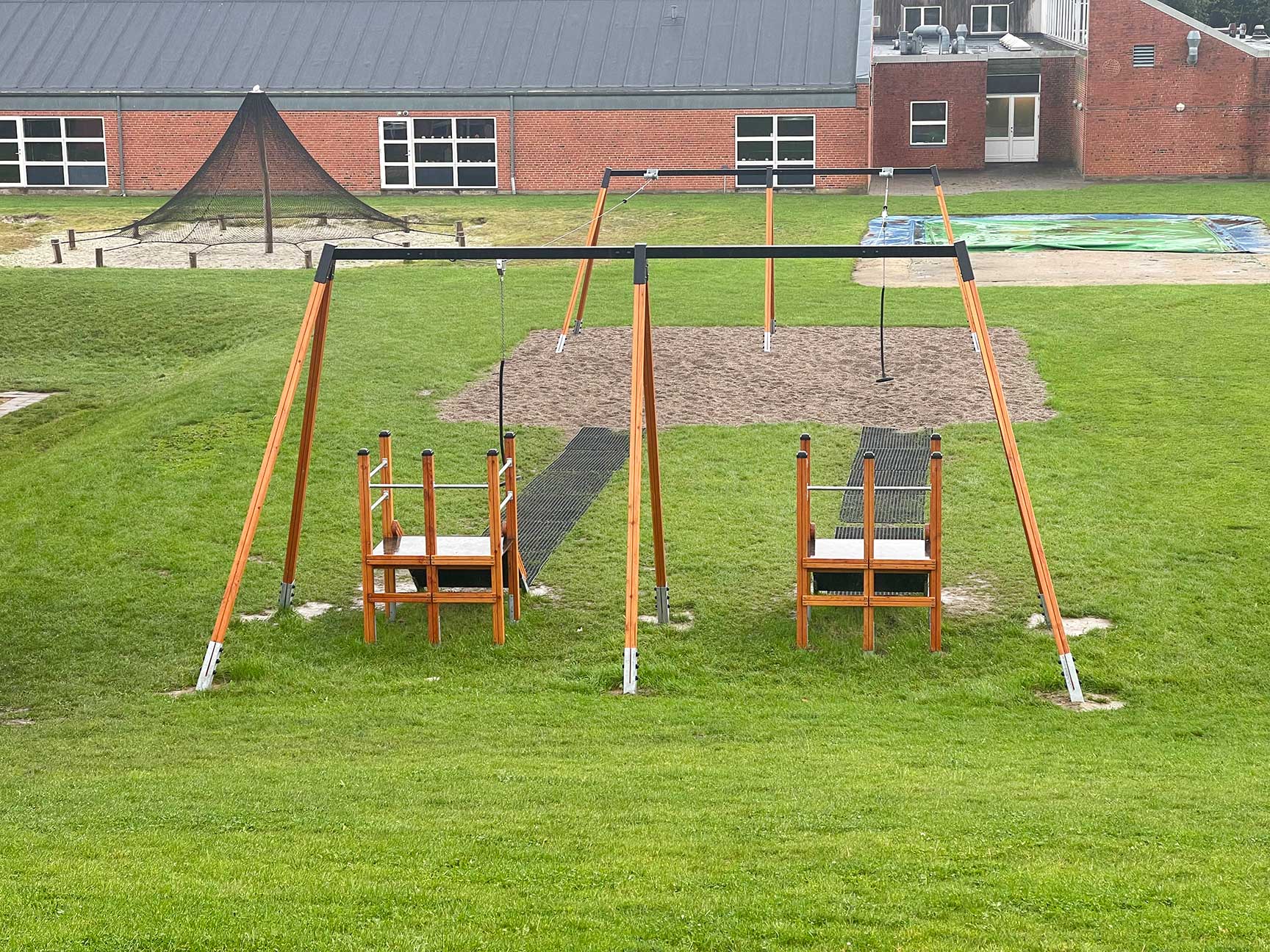 Skolan ville rusta upp skolgården med något nytt att göra på rasterna. Linbanan med dubbla plattformar passade perfekt in i ett befintligt grönområde och gör det möjligt att sväva mot varandra.