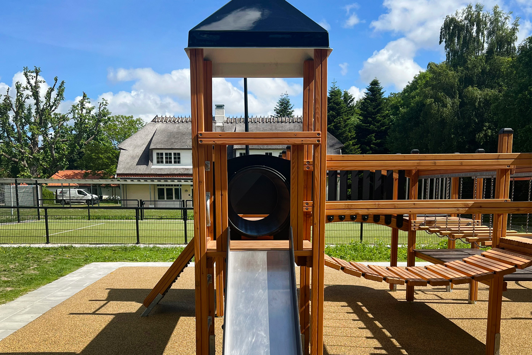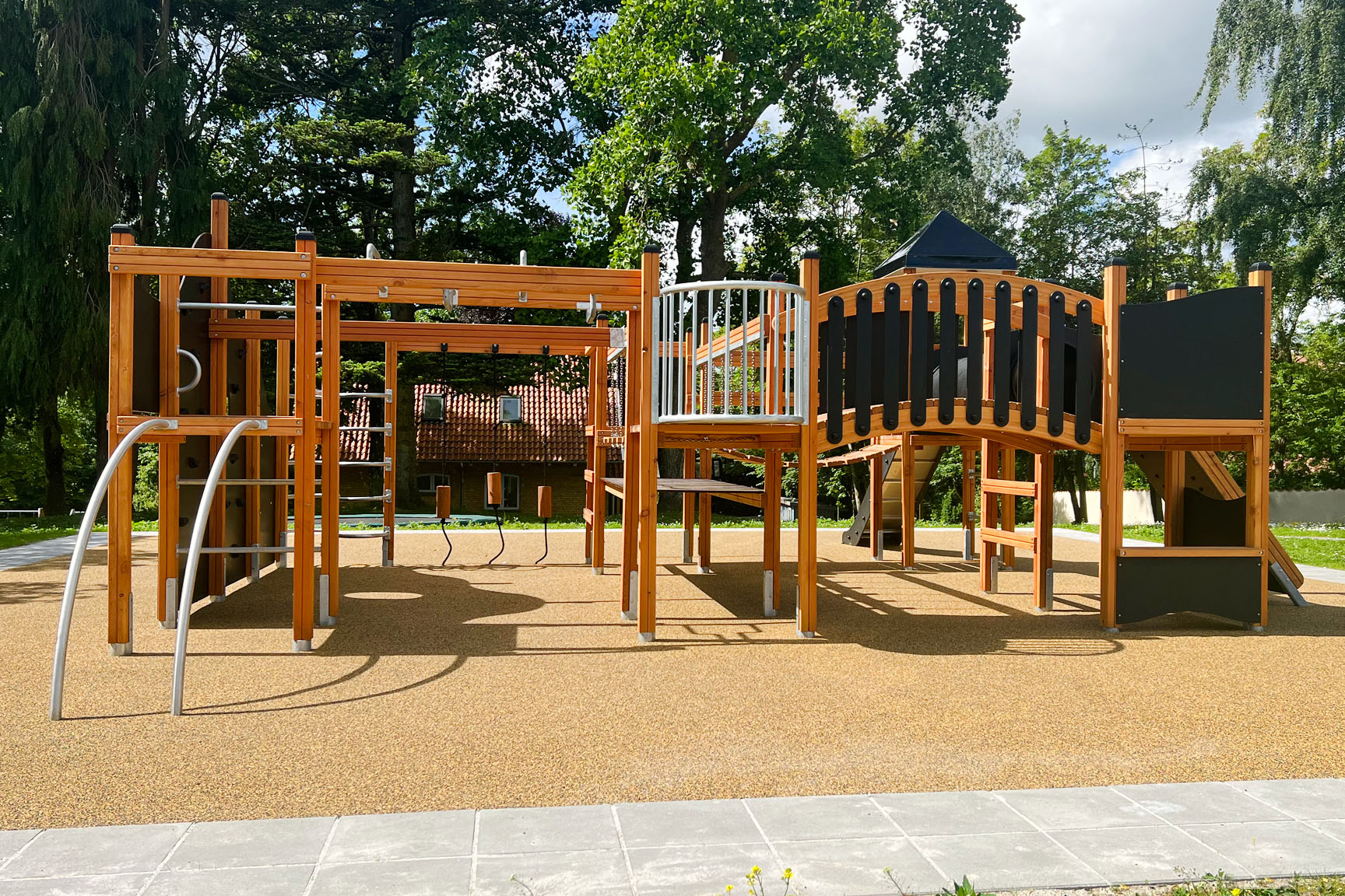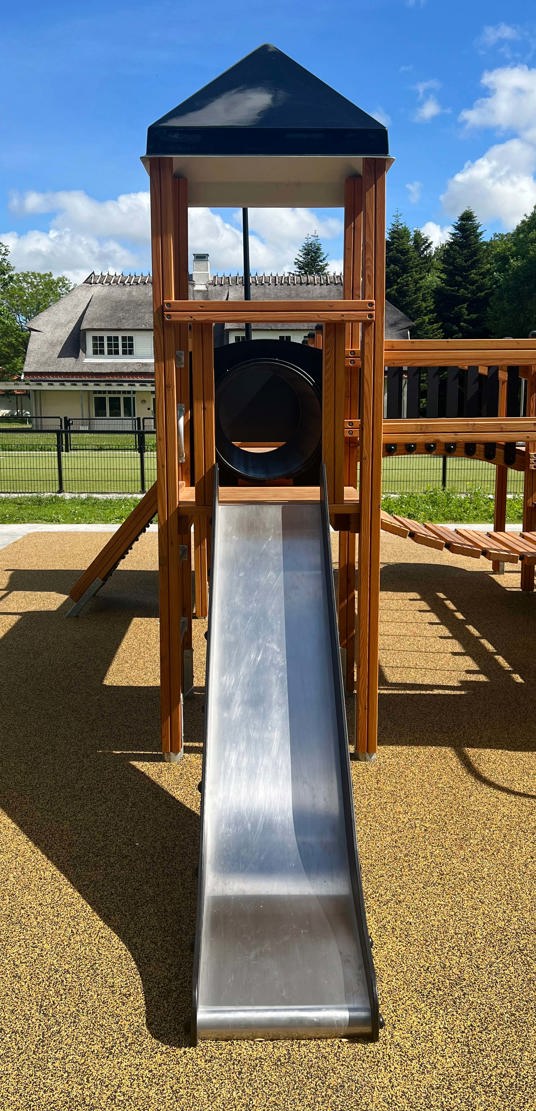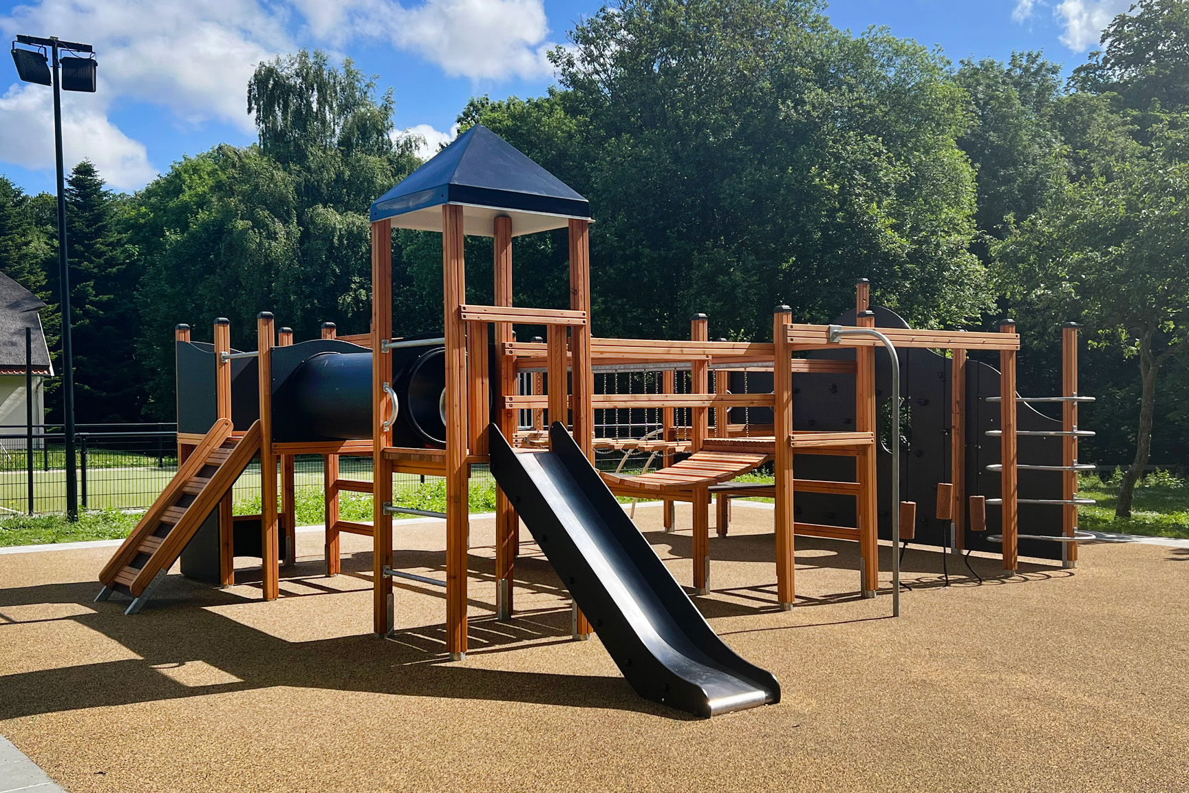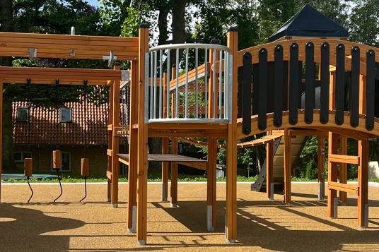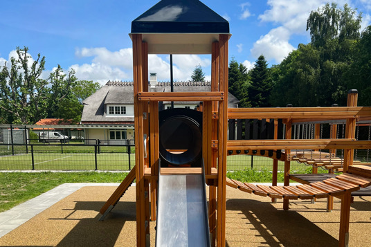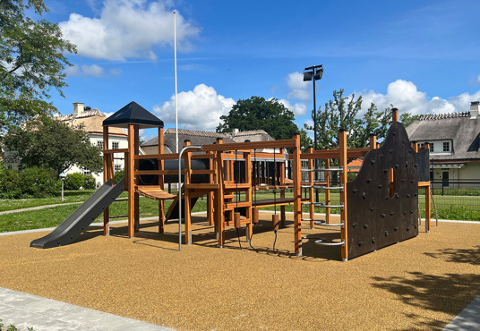Lekställningen erbjuder bland annat rutschkana, klätterramp, repstegar, armgång, hängbro, utkiksposter, klätternät, tunnel, brandmansstång och en stor utmanande klättervägg. Där är alltså massor av möjligheter till aktivitet och lek – till exempel tafatt-lekar, eftersom barnen kan ta sig runt på flera olika sätt.