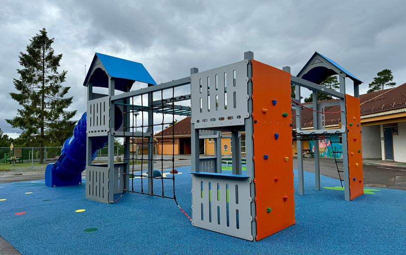 Lekställningen är baserad på vår "Hedvig" som vi har anpassat efter kundens behov och önskemål. Det kombinerar plattformslek med varierande och utmanande klättring. Barnen kan klättra på väggar, balansera på repbroar, använda repstegar och lianer, åka nerför rutschkanan eller träna styrka och koordination i armgången. Med flera utkiksposter och plattformar finns det gott om utrymme för lek och utforskning på olika nivåer.