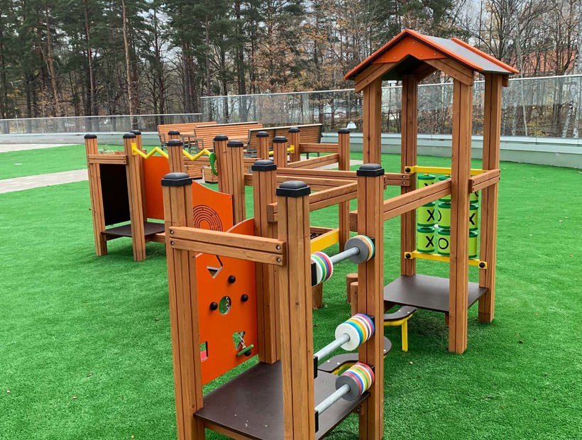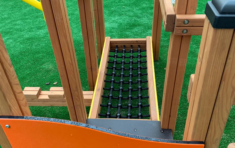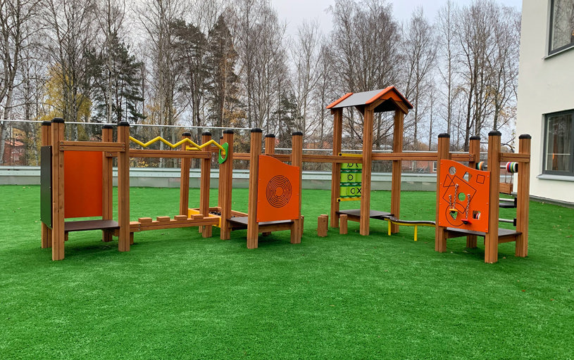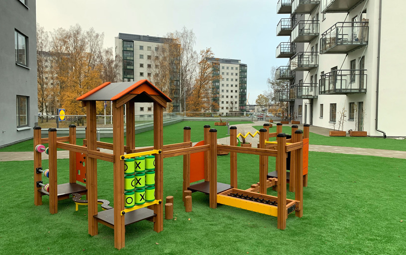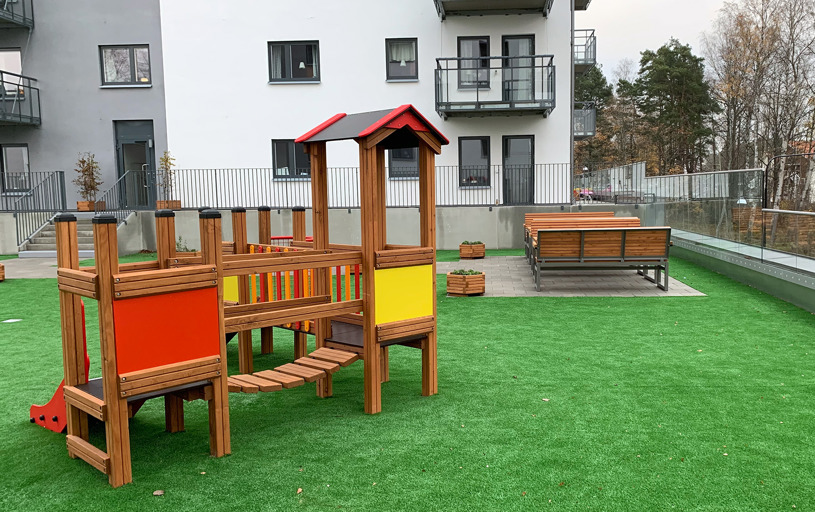 TAURUS är rejäla fristående designmöbler i lärk, samma vackra och hållbara träslag som i lekställningarna. Först tänkte man bulta fast möblerna i markplattorna, men det behövdes inte för de var så stabila i sig själva. Möblerna kom färdigmonterade från fabrik och kunde kranas upp till takterrassen och sättas på plats direkt. Med kompletterande blomlådor i samma träslag var innergården snart i ordning. Det gröna konstgräset var pricken över i:et och nu kan de boende leka, umgås och njuta av sin vackra takterrass.