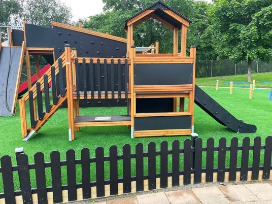 Den nya lekplatsen utrustades med mjukt och skönt konstgräs. Det är både snyggt och praktiskt, eftersom den inte påverkas av väder eller slitage som en vanlig gräsmatta.