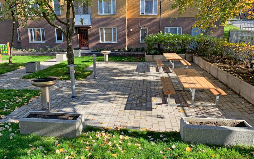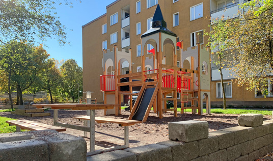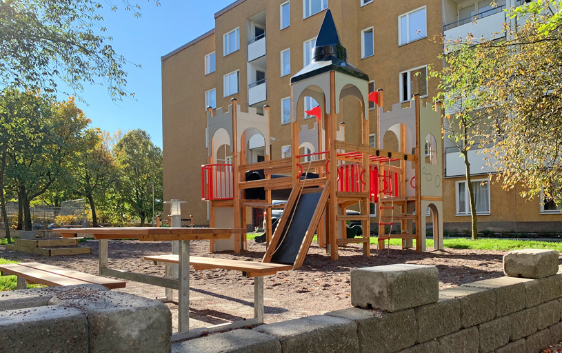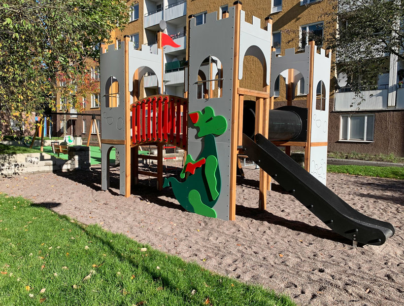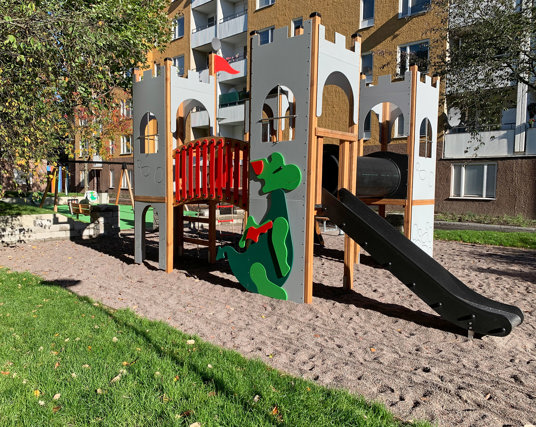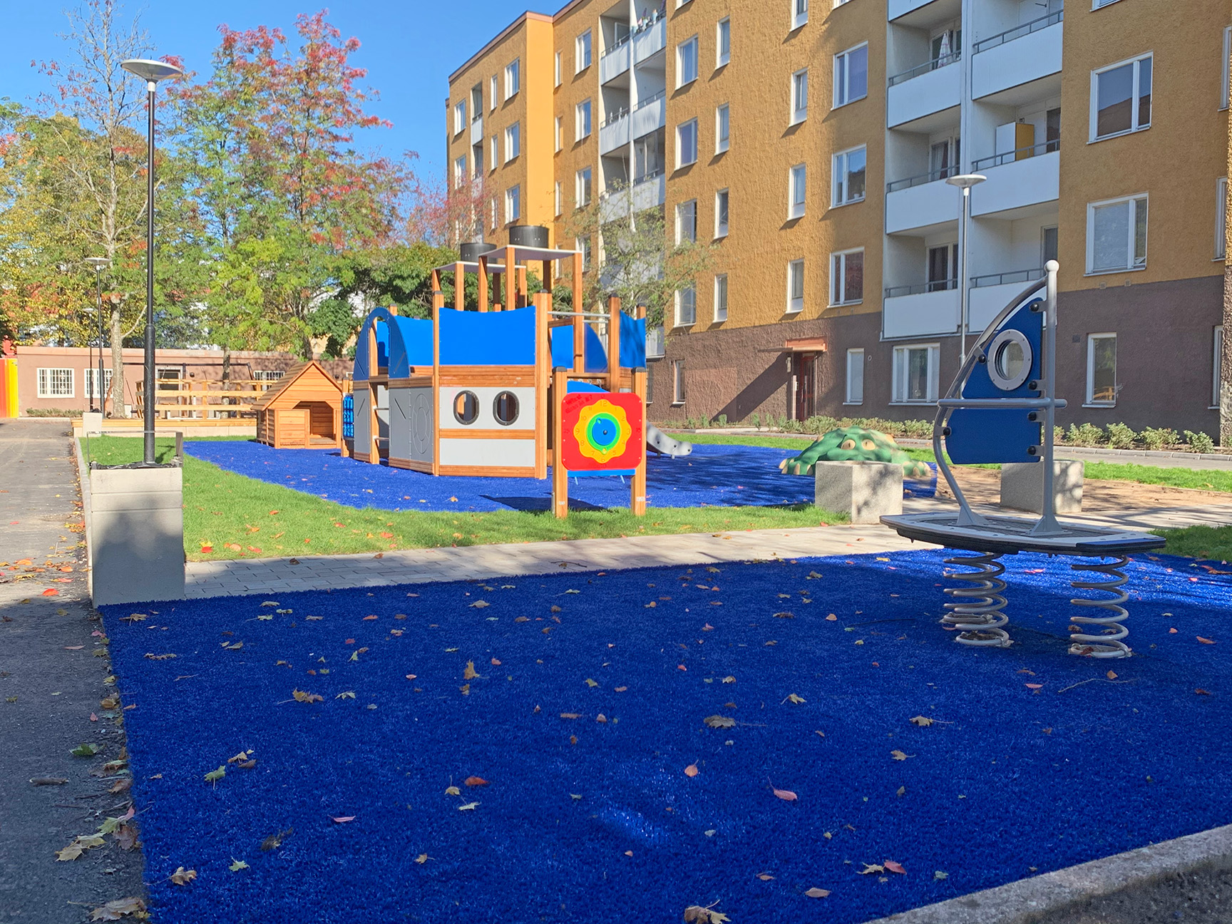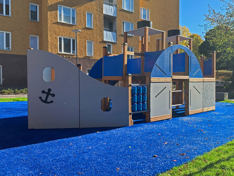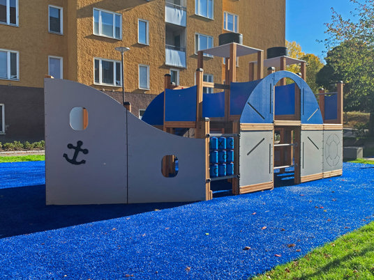 Till den ena av bostadsgårdarna valdes vatten- och båttema. Här kan barnen leka sjörövare på ångbåten, spana efter krokodiler från skeppsmasten och ankra vid lekstugan för en paus. Med det blåa konstgräset blev illusionen av öppet hav riktigt verklig, och det är lätt att fantisera om äventyr med kompisarna till havs.