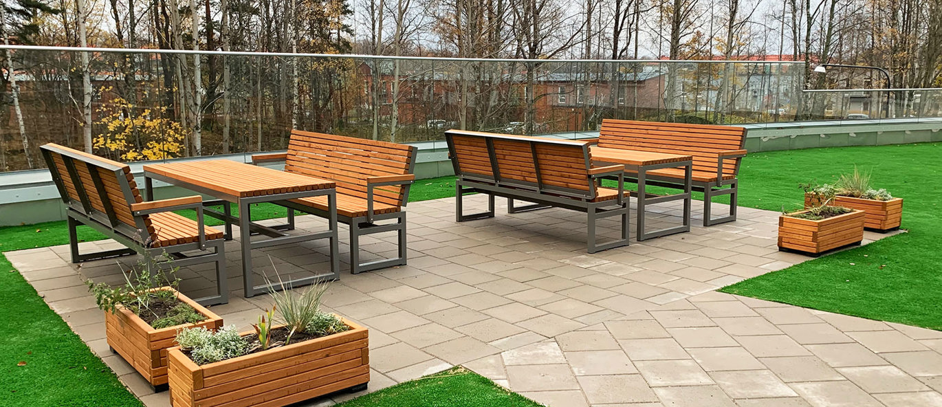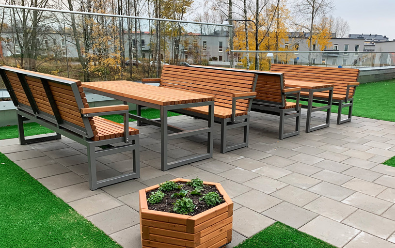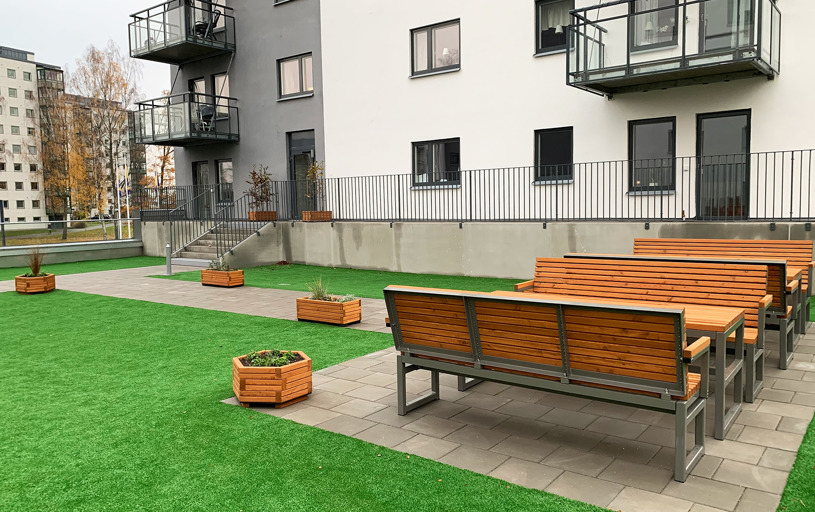 Genom att pulverlackera underredet på parkmöblerna i RAL 9006 White aluminium, kunde man plocka upp den grå färgen från delar av husfasaden. En snygg detalj som gör det där lilla extra på en så här speciell plats. Dessutom beställdes både runda och rektangulära blomkrukor tillverkade av lärkträ, för att ytterligare förstärka känslan av harmoni på innergården. Den gröna konstgräsmattan blev pricken över i:et som band ihop de olika delarna av takterrassen.