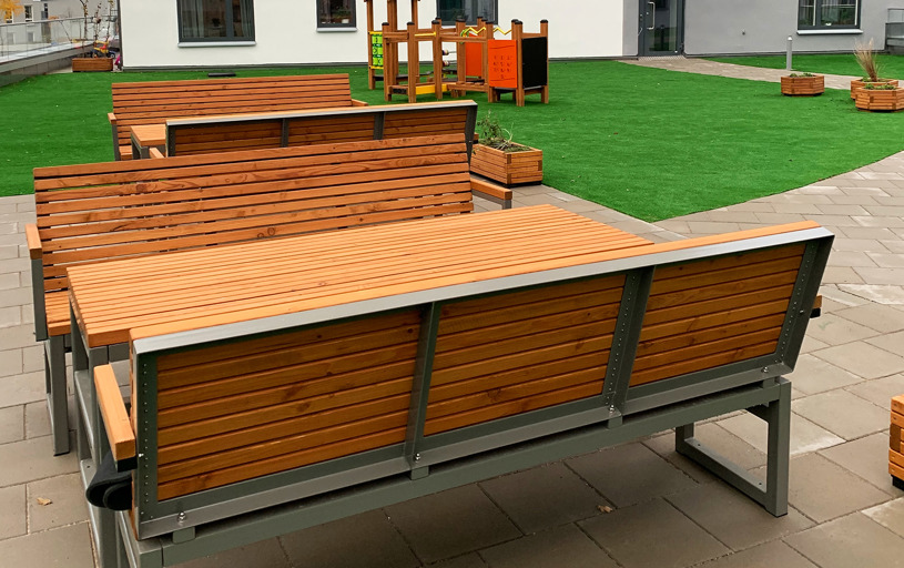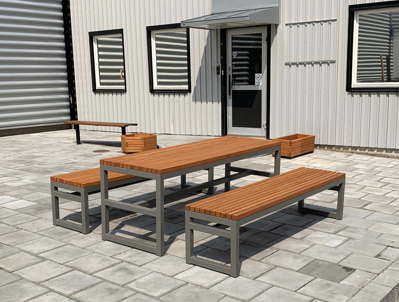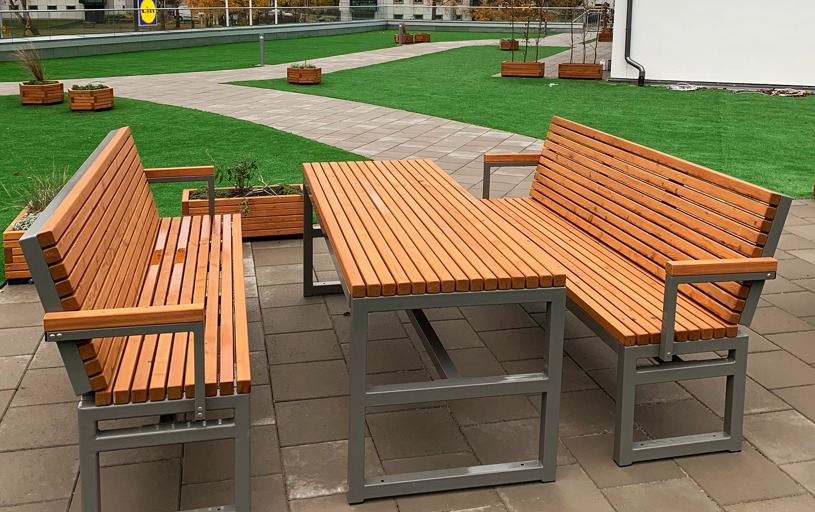 För att matcha lekställningarna började man leta efter parkmöbler i samma stil, som kunde passa in på innergården. Här krävdes det något annat än vanliga bänkbord. Entreprenören John var bekant med Mobilis Designs möbelsortiment sedan tidigare. Han valde direkt ut TAURUS-familjen som sin favorit för detta projekt. TAURUS-möblerna är robusta och tåliga och ger ett kraftfullt uttryck samtidigt som de är komfortabla och stilfulla. Fastighetsägaren var mycket nöjd med förslaget och Calle på Tress tog hand om beställningen.