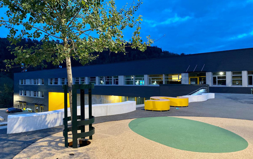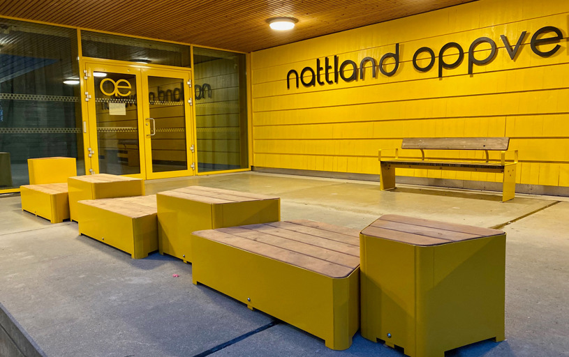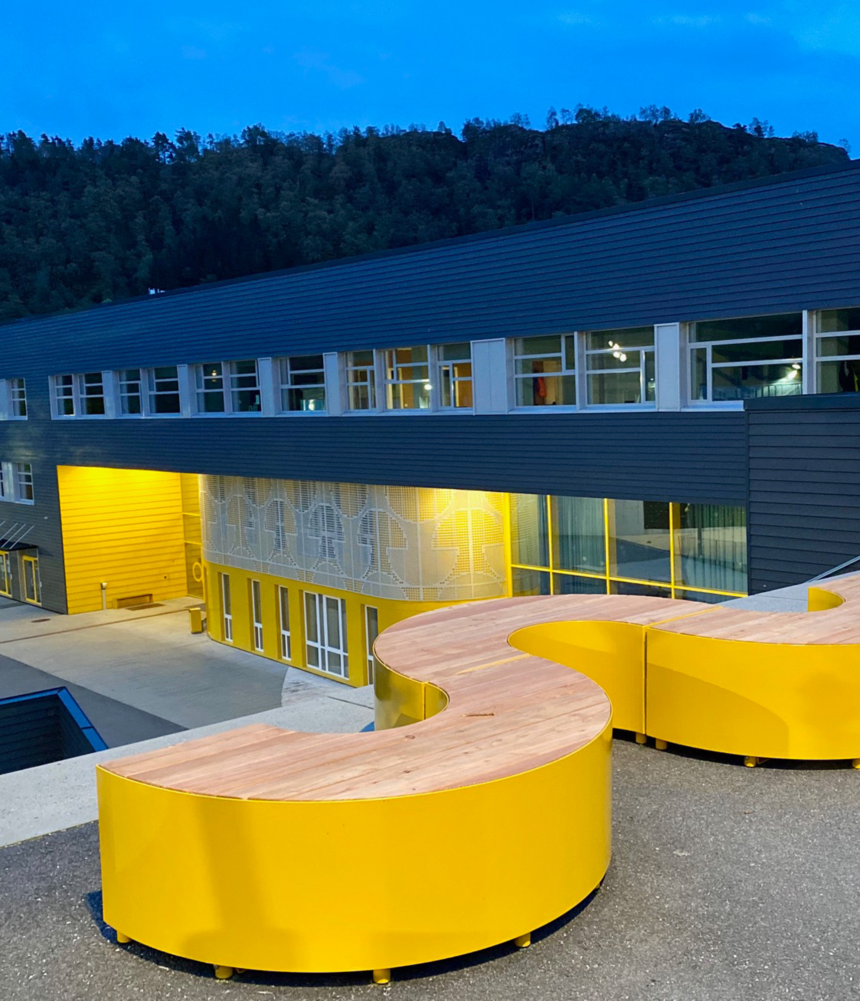 Utanför Nattlands skola och förskola står moderna sittgrupper och bänkar från våra Mobilis Design-serier AQUILA och DELPHINUS. Skolans RAL-färg, som du hittar på flera ställen i byggnaden, går igen som en röd tråd i sittmodulerna vid entrén. Den iögonfallande gula färgen, de organiska formerna och de fina lärkdetaljerna resulterade i ett stilrent blickfång vid skolans huvudentré.
