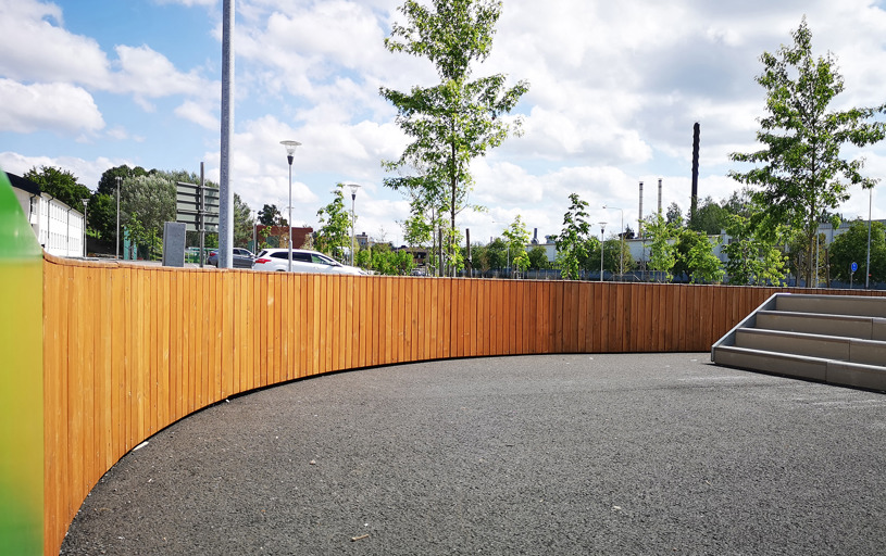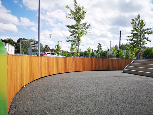 Den flexibla multiarenan InsideOut ramar in skateparken och skyddar samtidigt från trafiken på gatan utanför. Sargen är utrustad med en musikbox och erbjuder sittplatser för alla som vill hänga här.