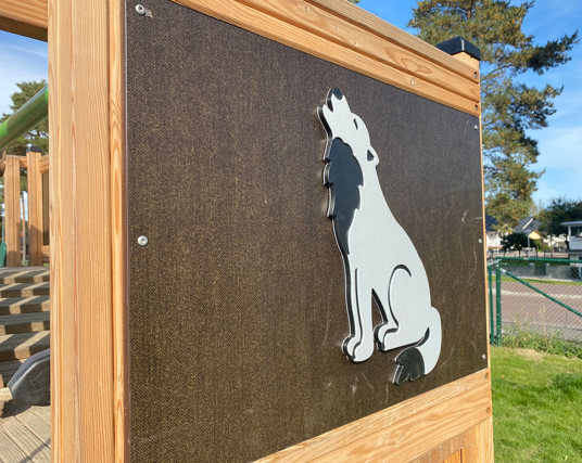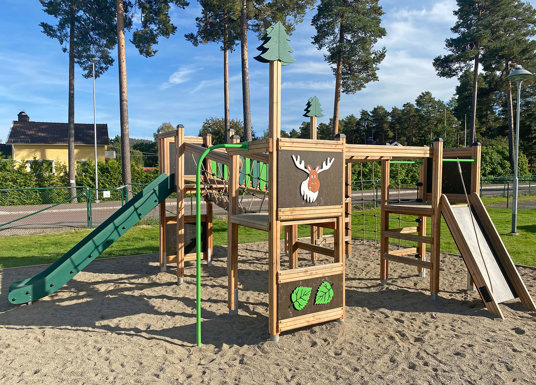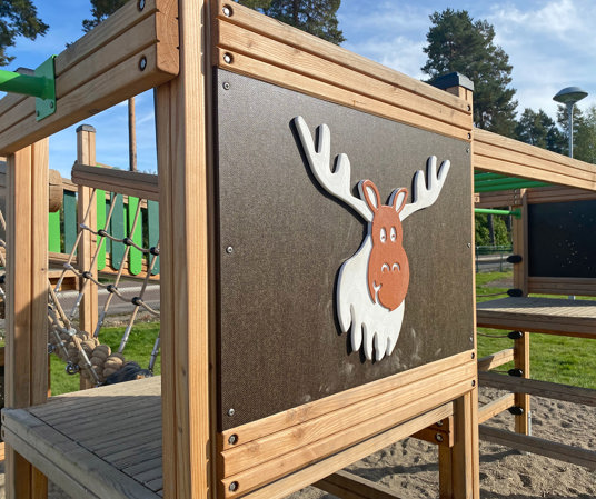 Skolgården uppmuntrar verkligen till fysik aktivitet, rörelse och lek. Här byttes motivet ut på lekställningen Djungeläventyret till Jämtlandsinspirerad skogsmiljö med granar, björkar, älgar, björnar och vargar.