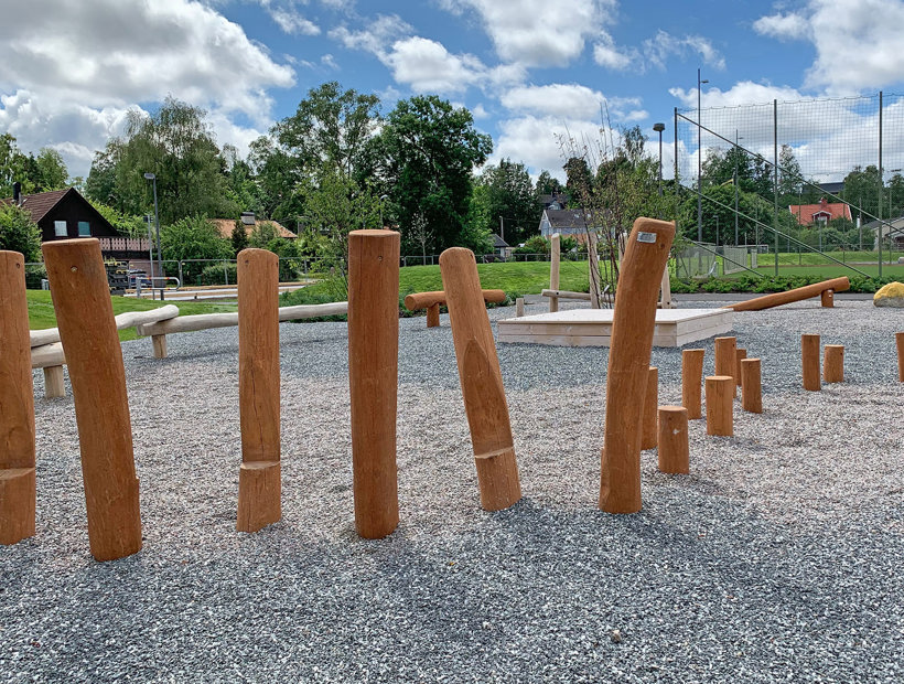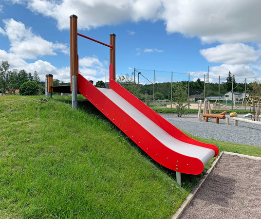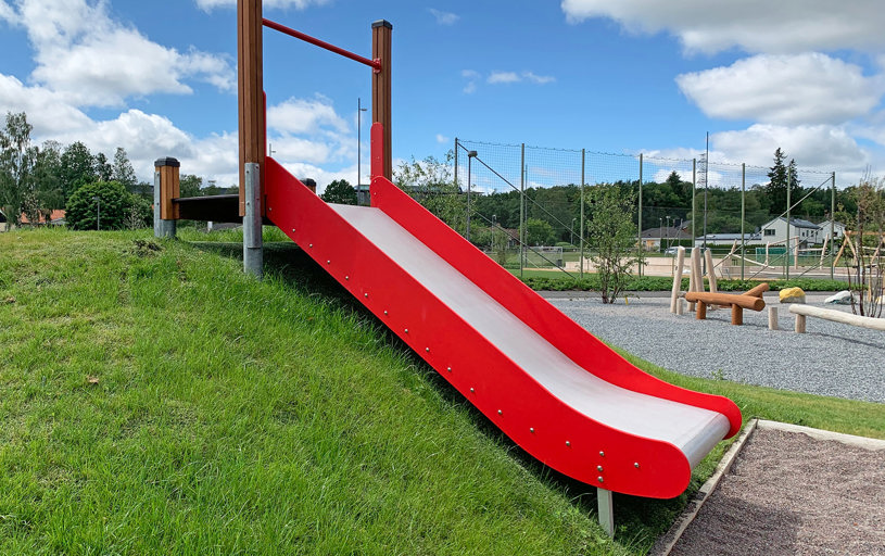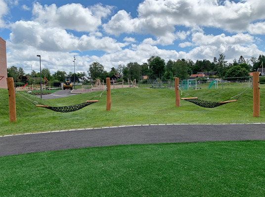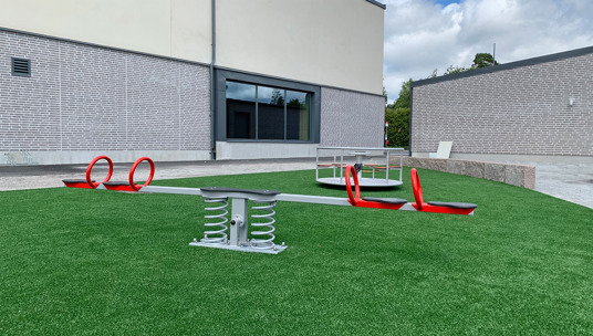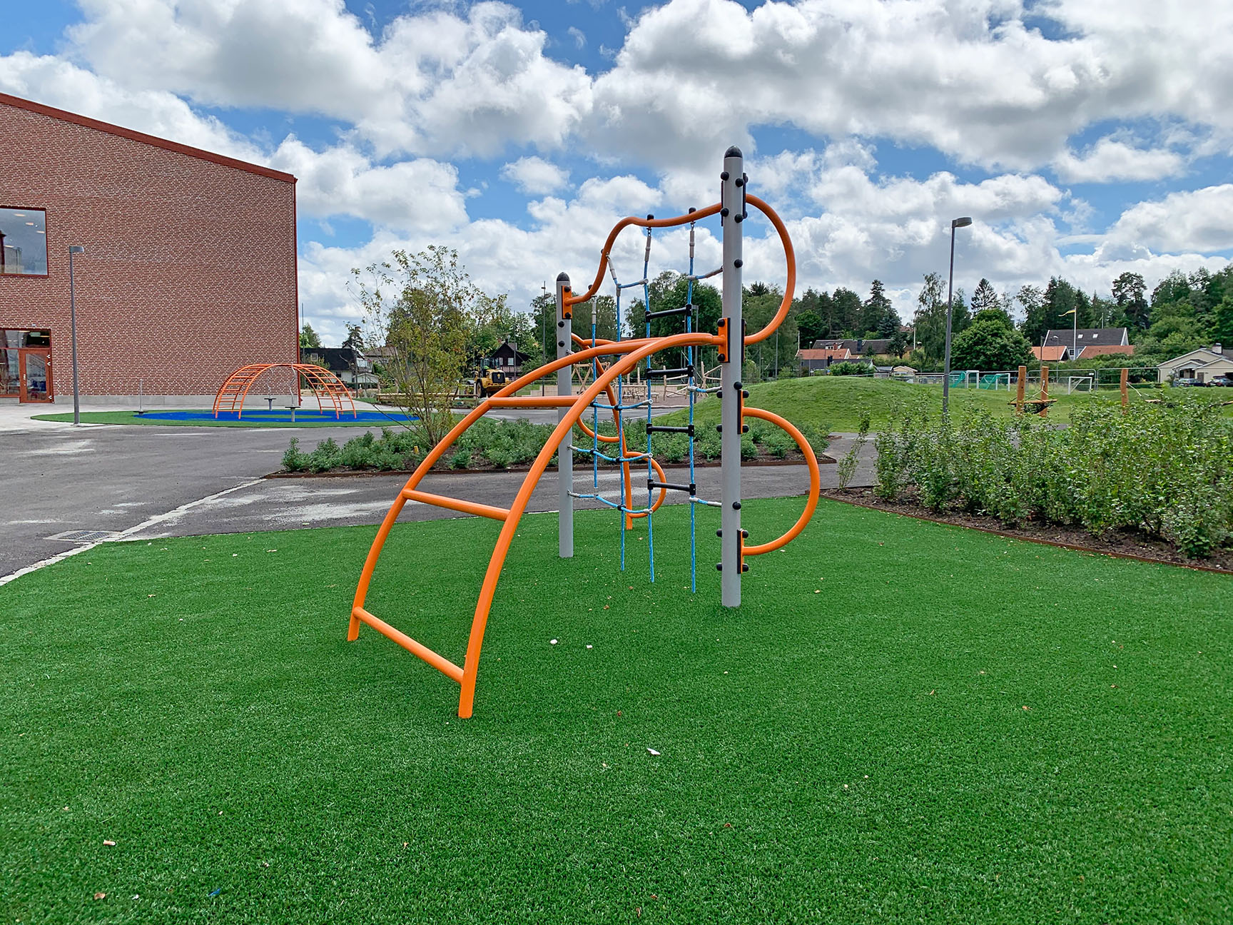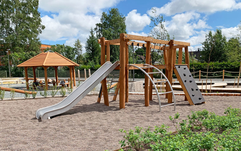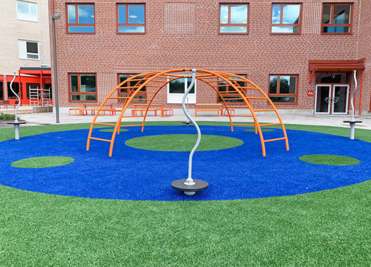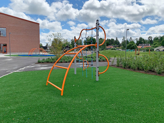 Här valdes medvetet sprakande och härliga färger på klätterställningar och sportutrustning. Med mycket grönska blir skolgården ett perfekt andningshål för både elever och personal.