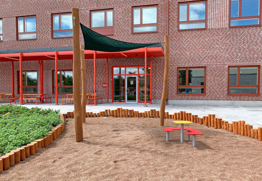 Utemöblerna från Mobilis Design och möbelfamiljen PICTOR passade fint in i skolans utemiljö. Här valdes samma färgskalor som på lekutrustningen och skolans fasad, vilket skapar extra harmoni och trivsel.
