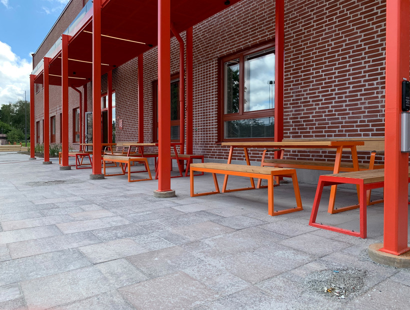 Utemöblerna kommer från Mobilis Designs sortiment och här föll valet på familjen PICTOR. Med sin inbjudande design och pulverlackering i samma färgskalor som på lekutrustning och skolans fasader, finns här maximal möjlighet att ha samling, umgås och njuta av det fina vädret.