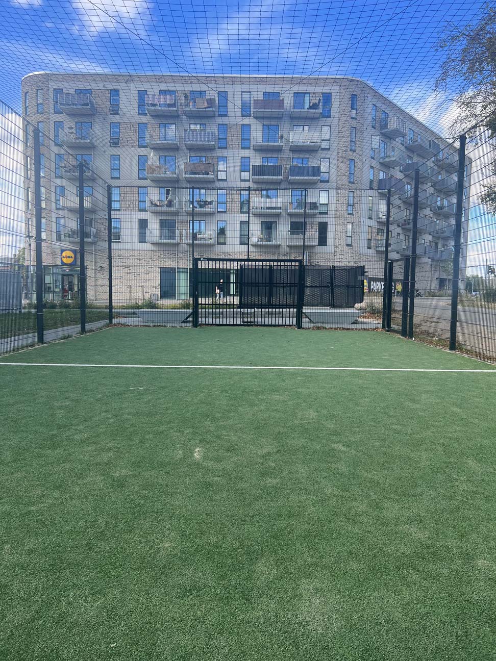 Multiarenan levereras med extra höga staket runt om samt ett nät över hela arenan. På så sätt undviks att bollar kommer på avvägar och orsaka olyckor på den livliga Carlsbergvej. Det finns ingångar till planen via en grind och öppning i sidorna på målet som vetter bort från vägen.
