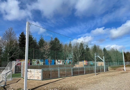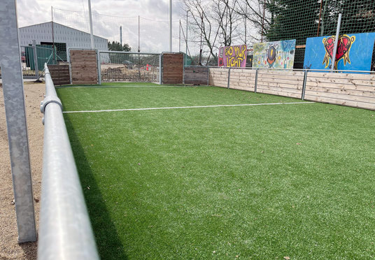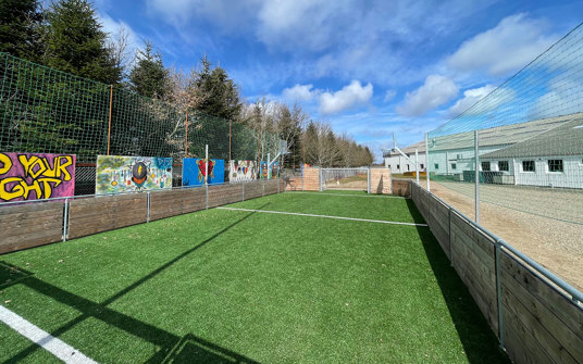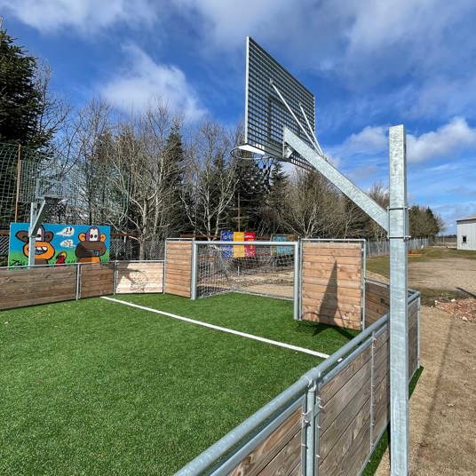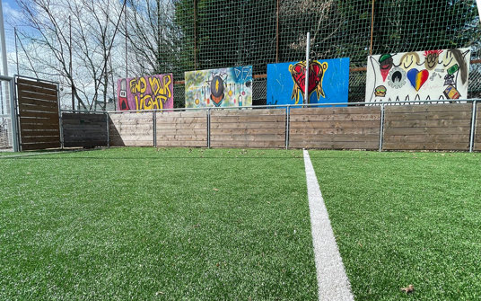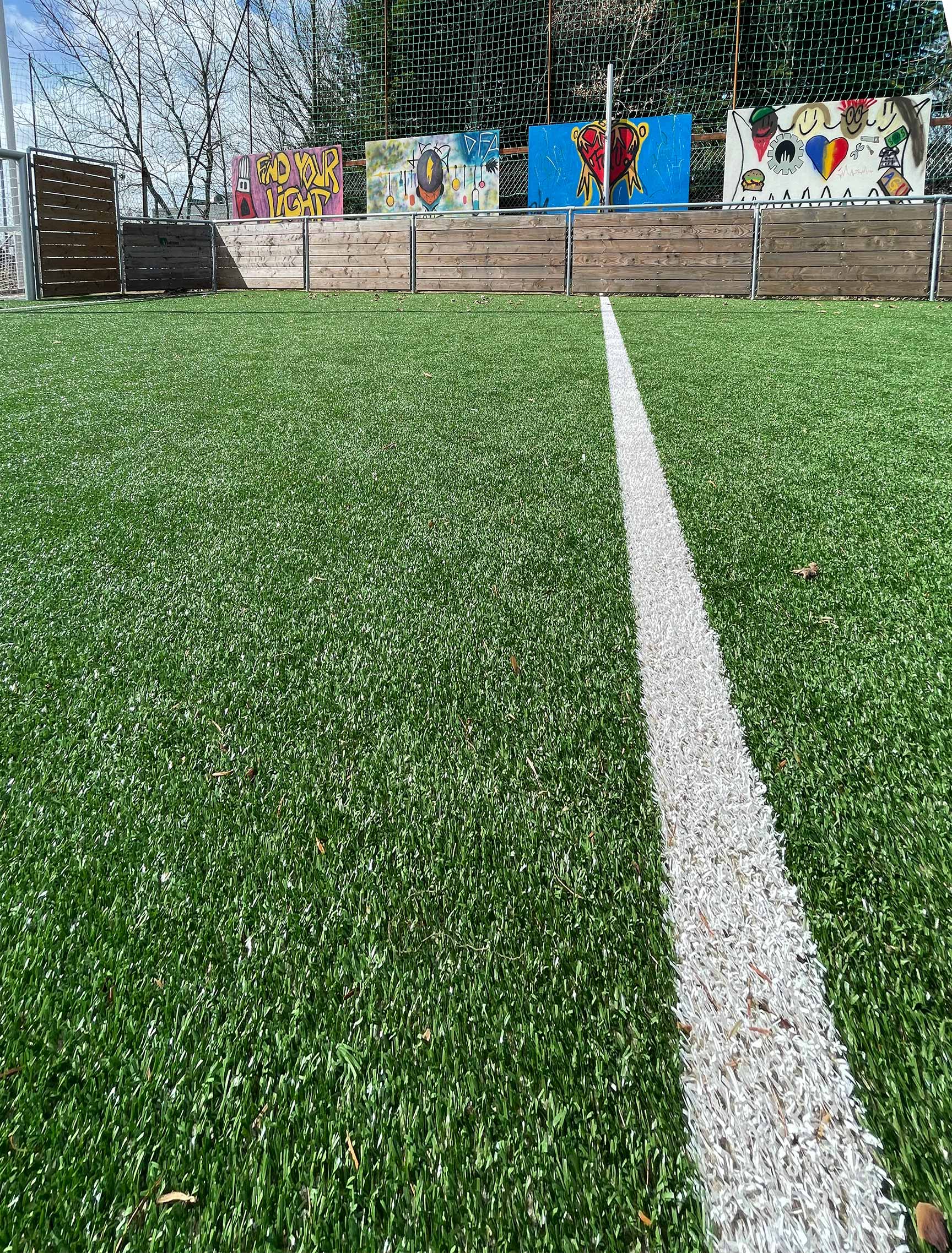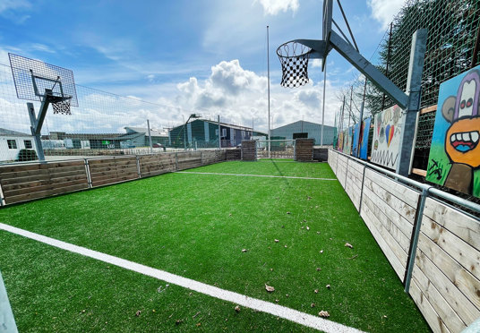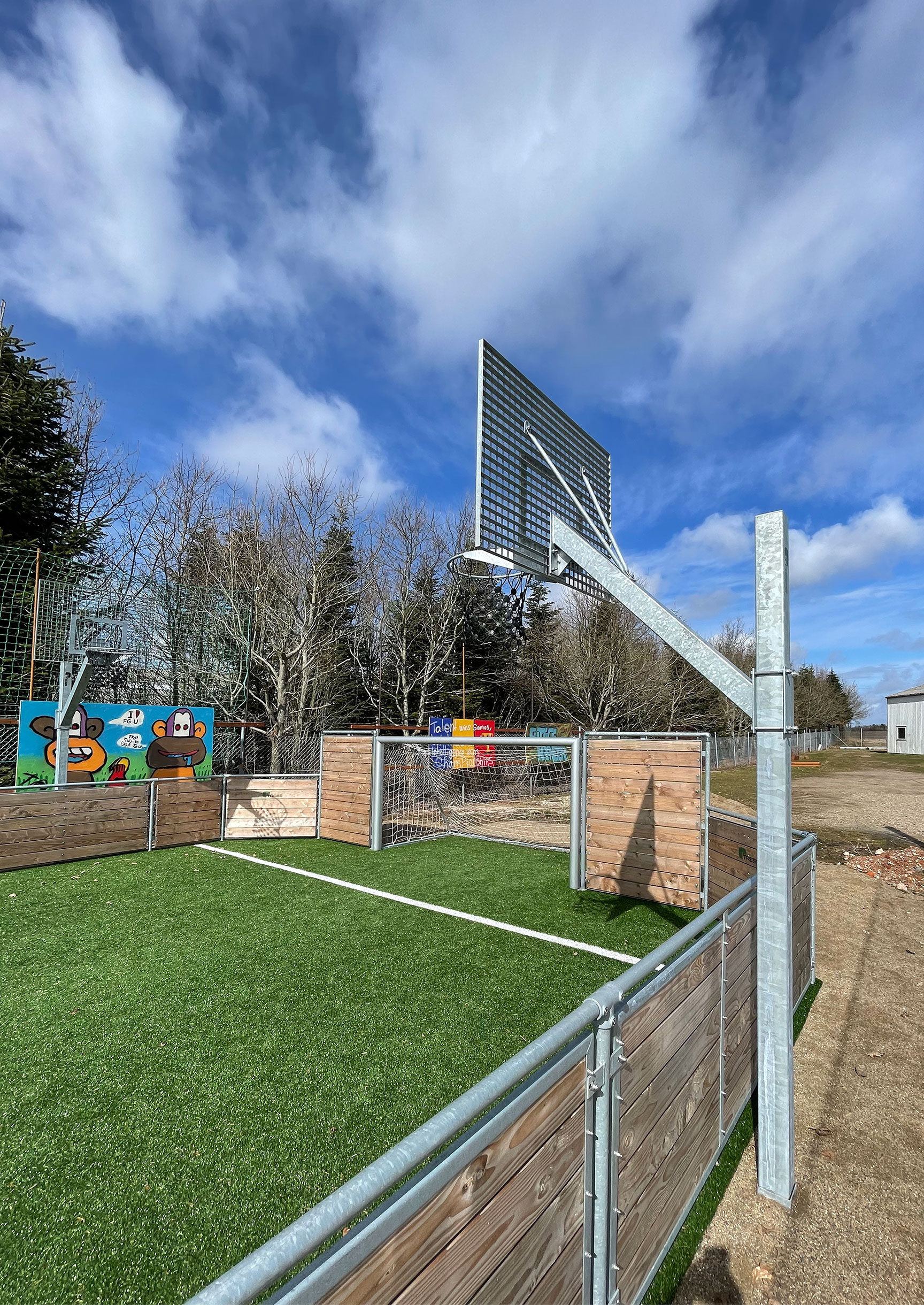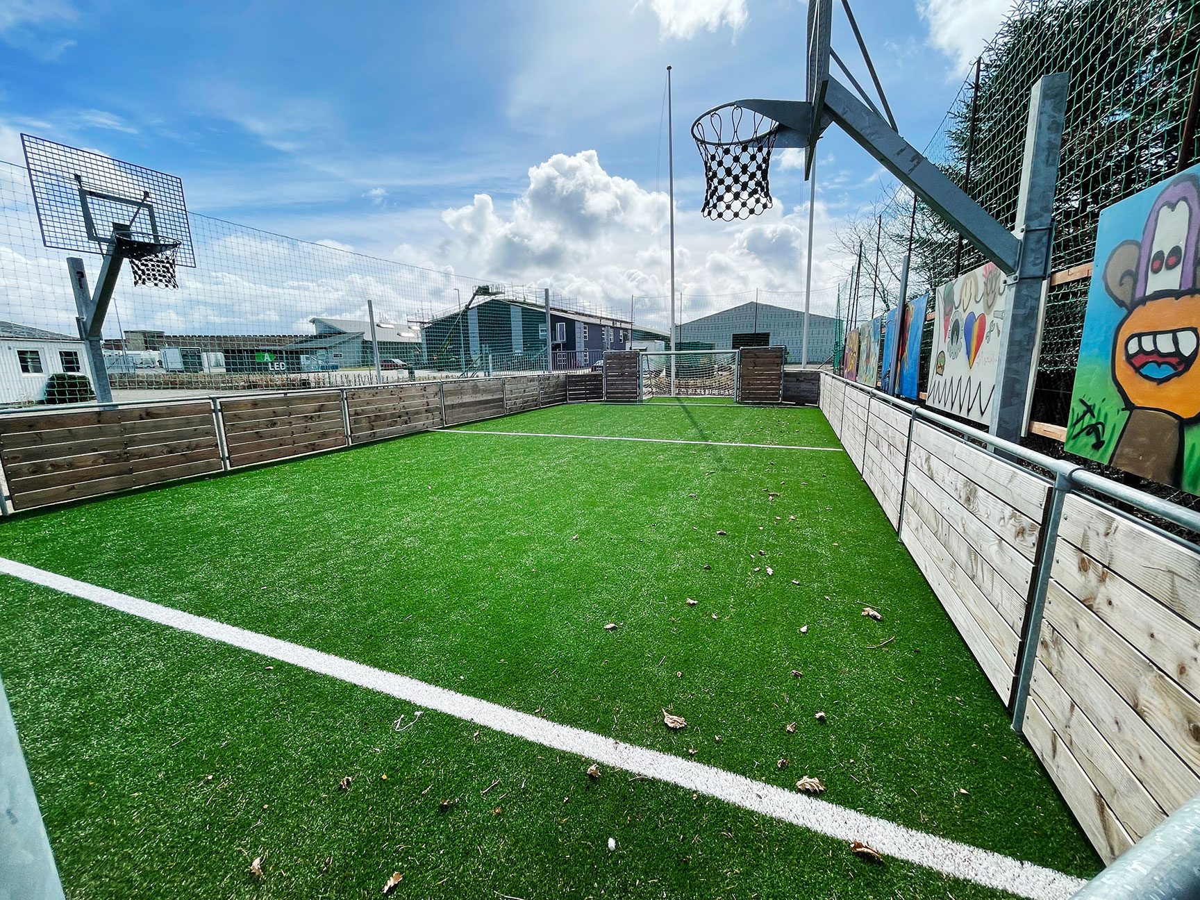 FGU Vest har på ett relativt litet utrymme skapat en multiarena med massor av användningsmöjligheter. Här finns stora mål, basketkorgar och extra småmål som enkelt lyfts in på planen när det är dags att spela landhockey, innebandy eller smålagspel i fotboll.