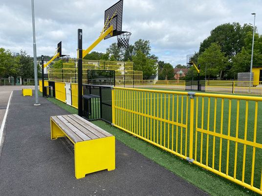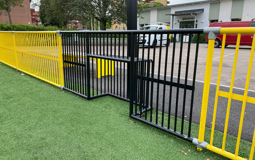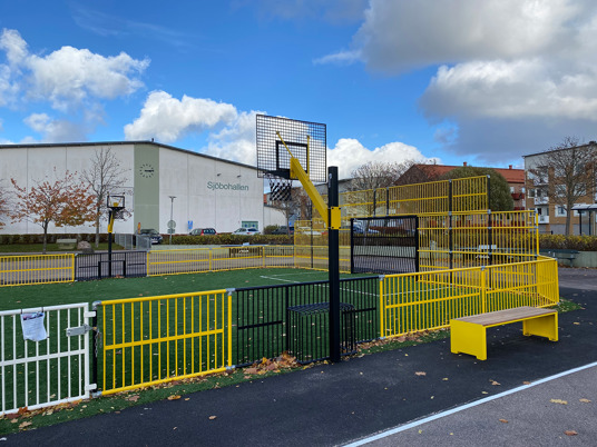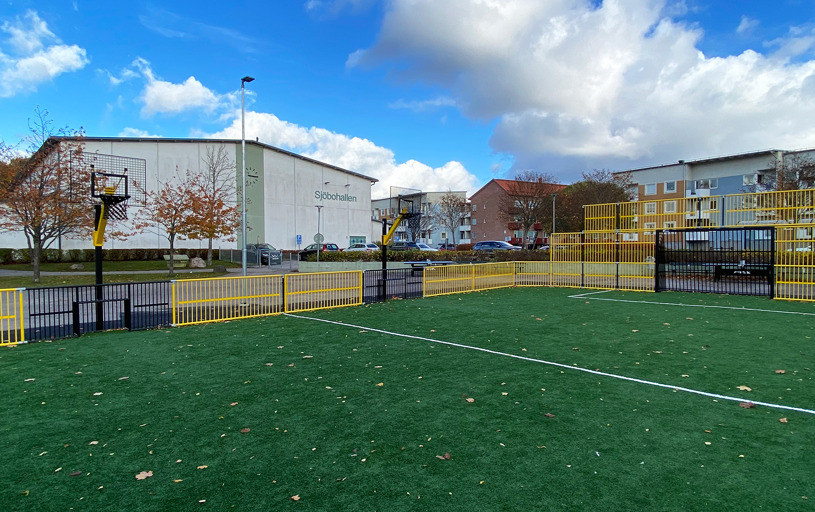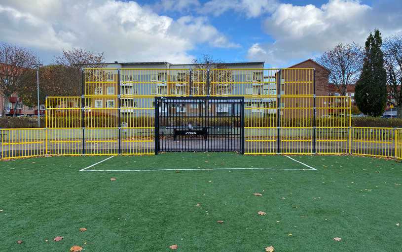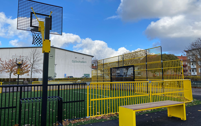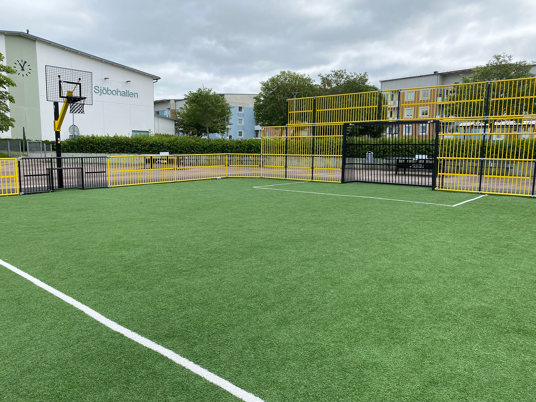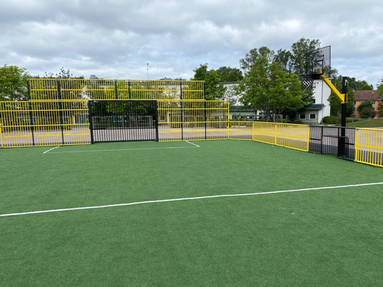 Multiarenans sarg och mål lackerades i gult och svart vilket ger en härlig och inbjudande färgklick på skolgården. Även arenans storlek anpassades för att passa in på den tilltänkta ytan. Tress multiarenor består av sektioner så det är enkelt att anpassa storlek efter önskemål.