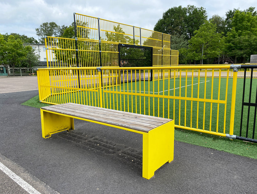 Precis utanför multiarenan placerades två CENTAURUS 4-sits bänkar från Mobilis Design-sortimentet. Bänkarna lackerades i samma gula färg som multiarenan vilket matchar riktigt snyggt. Perfekt till både publik, omklädning och vilopaus.