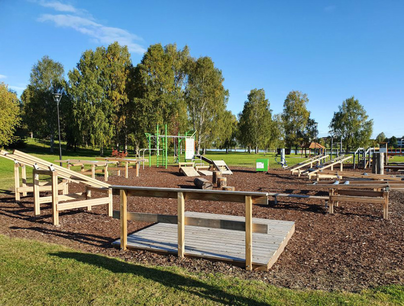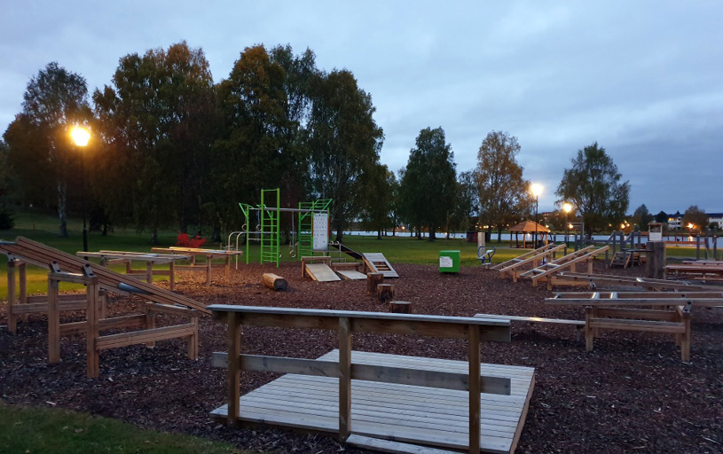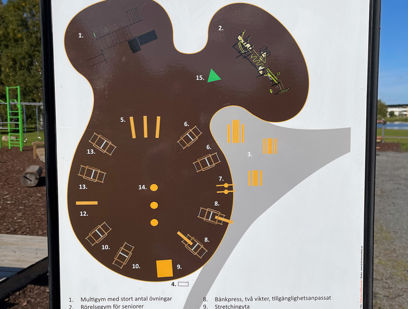 Flera av träningsstationerna av trä finns med två olika vikter för både lättare och tyngre träning. Några av stationerna är dessutom tillgänglighetsanpassade. Här finns också plats för stretching och vila mellan övningarna.