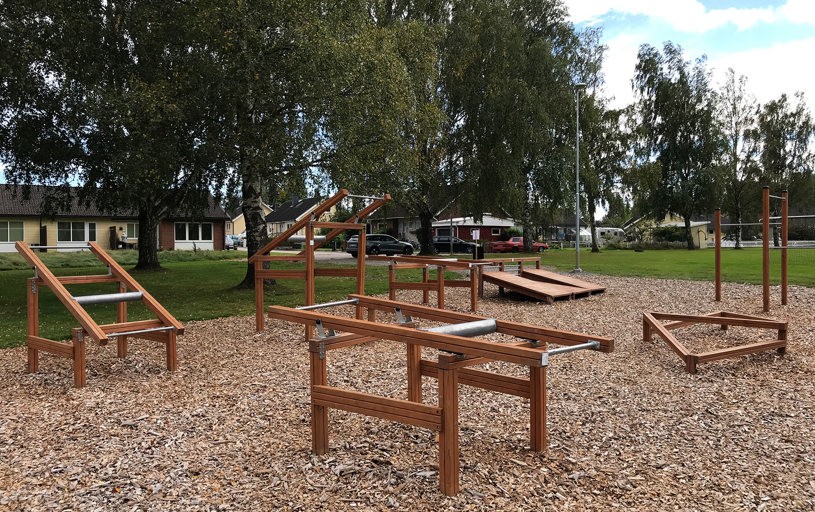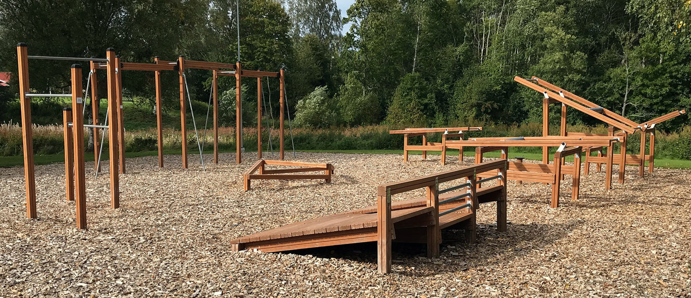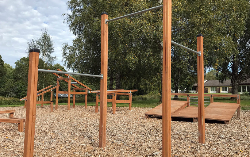 Utegymmet är av lärk och som underlag valdes träflis, en trevlig helhet som smälter bra in i de gröna omgivningarna. Lärkträ är ett tåligt träslag som kräver minimalt underhåll och står sig bra i vårt nordiska klimat.