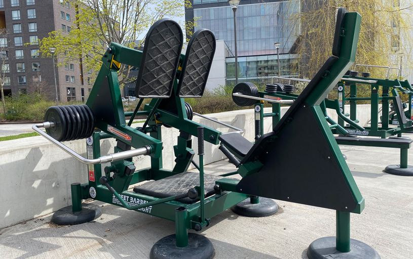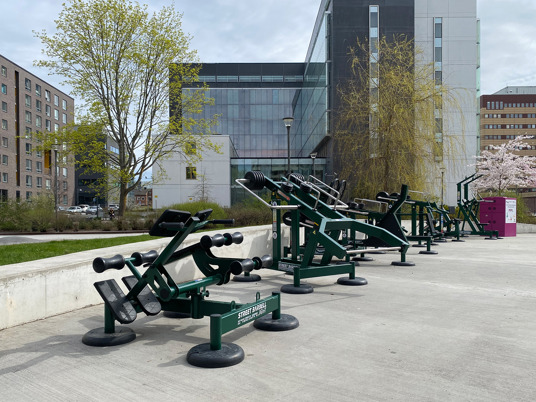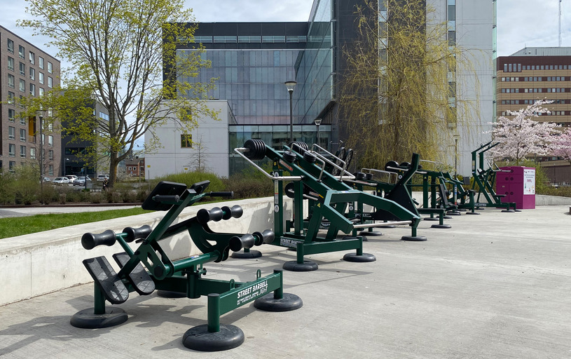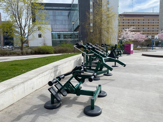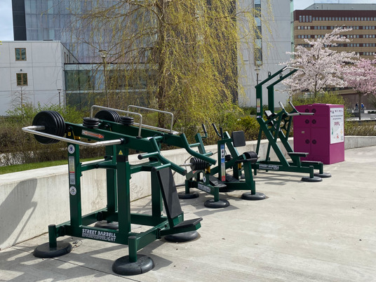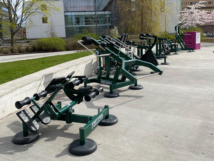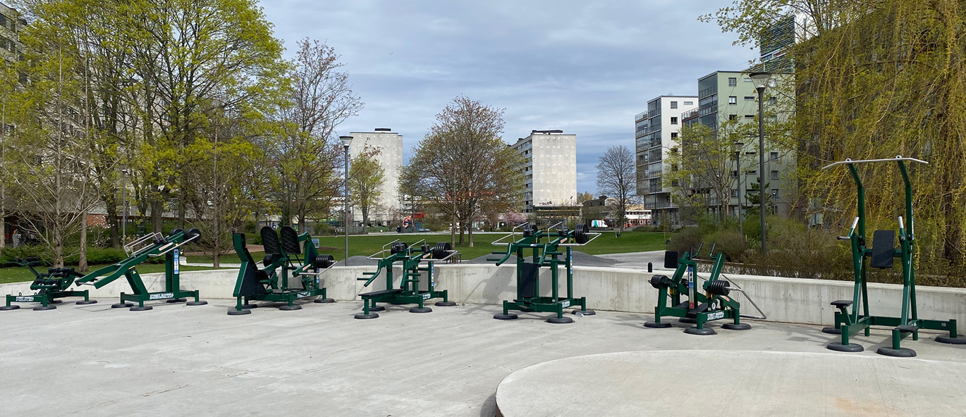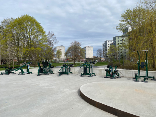 De justerbara träningsmaskinerna är pulverlackerade i RAL 6005 Moss Green. En härligt mörkgrön färg som smälter in med allt det gröna runt omkring i parken.