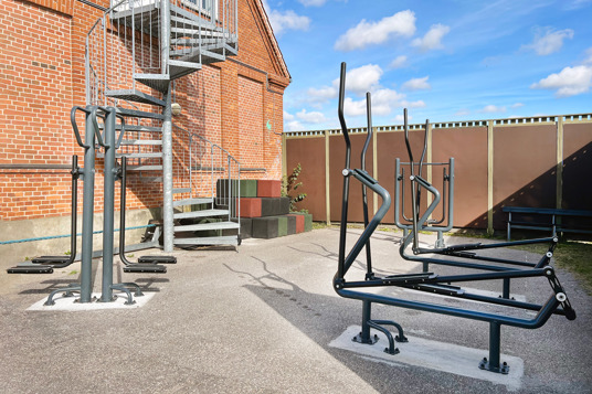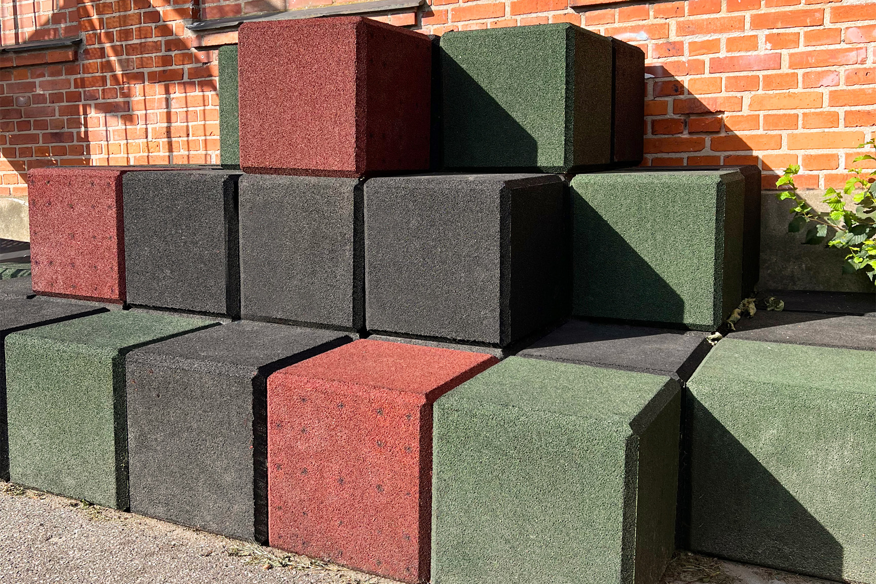 Den nya aktiva utemiljön utnyttjar en annars tom innergård. Här har det nu skapats en fin mötesplats med de många gummikuberna och träningsmöjligheter på träningsstationerna.